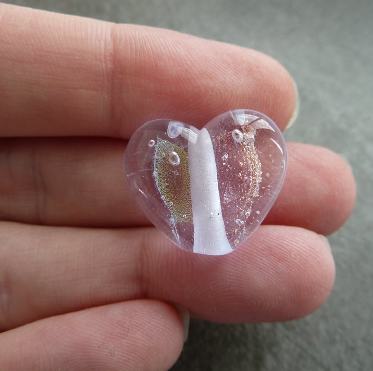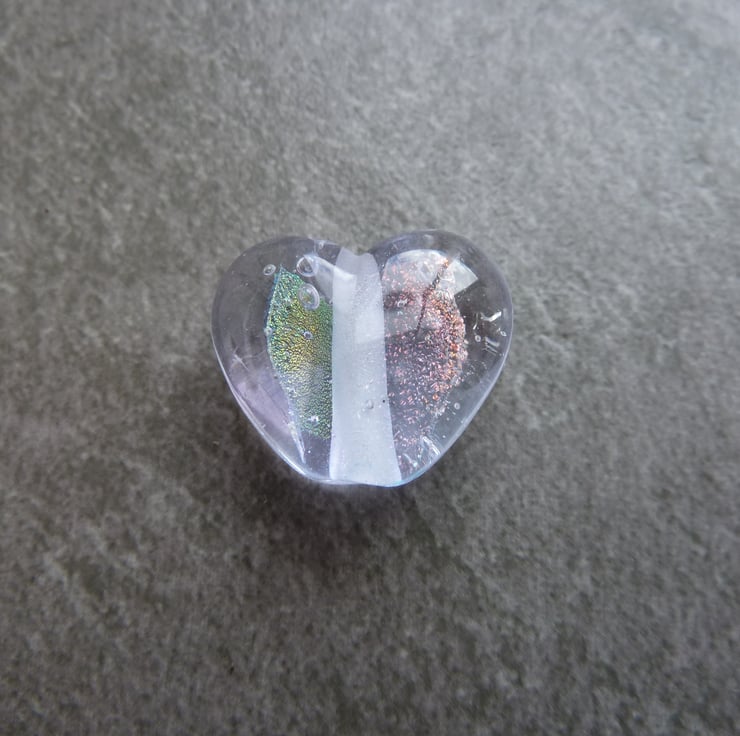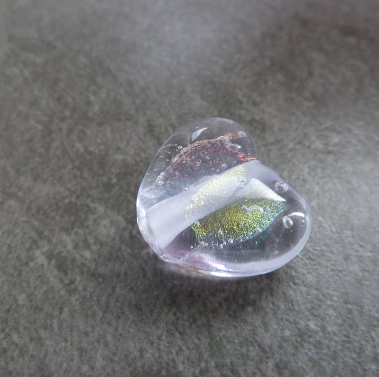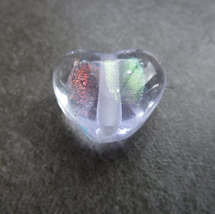 A lampwork glass bead made with lilac glass and shaped into a heart using a brass press. The heart features dichroic glass.