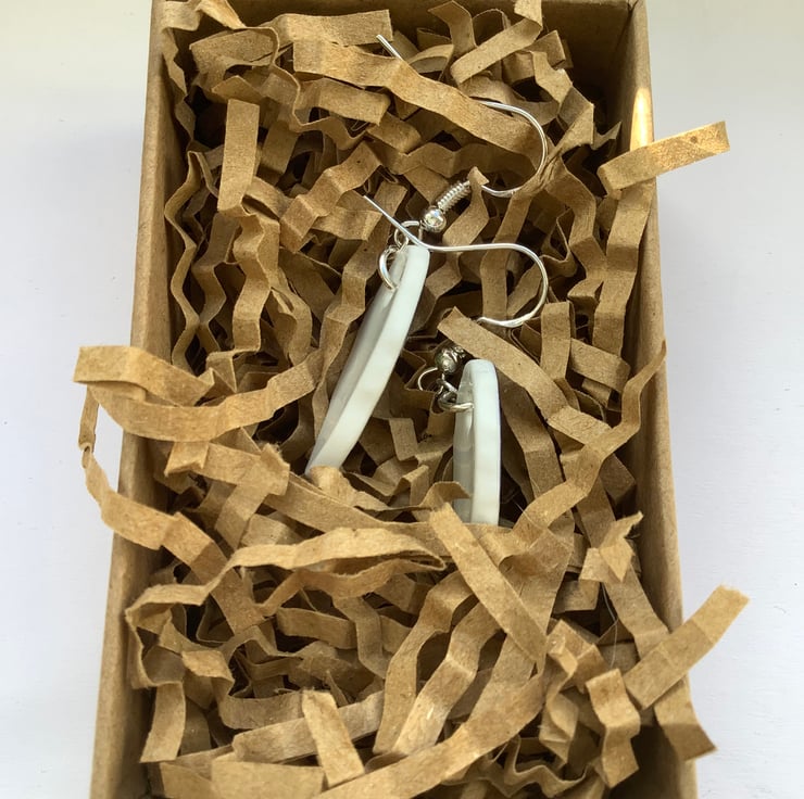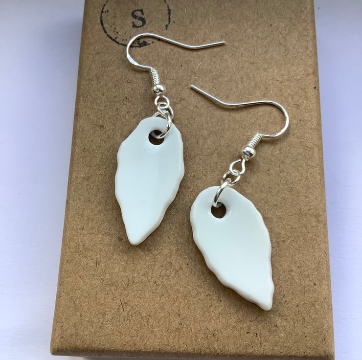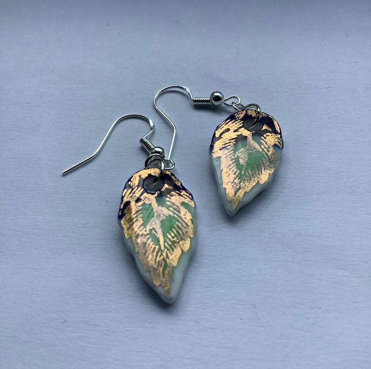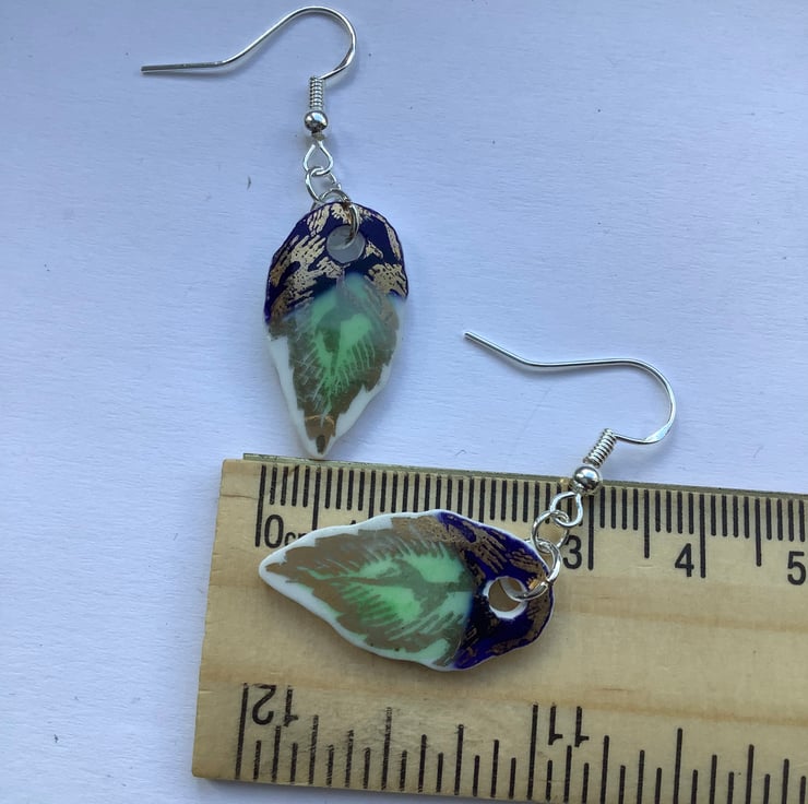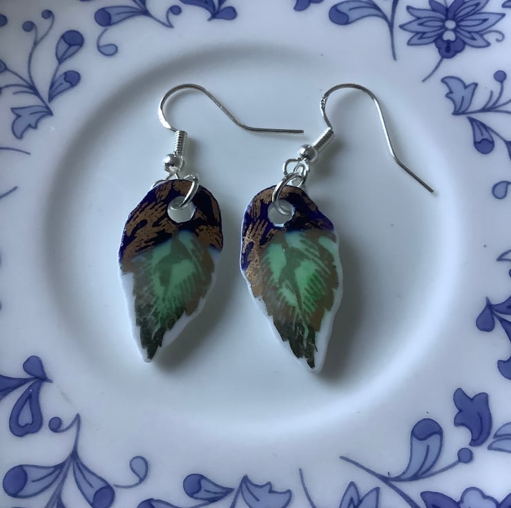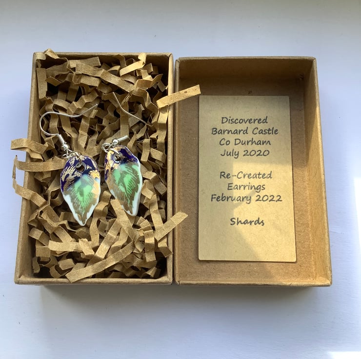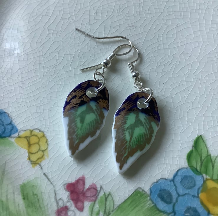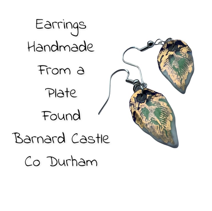 These drop earrings are made from the same area of plate, the shards are similar but the final shape isn’t perfect or identical. Unique, completely one of a kind, hand painted pattern.