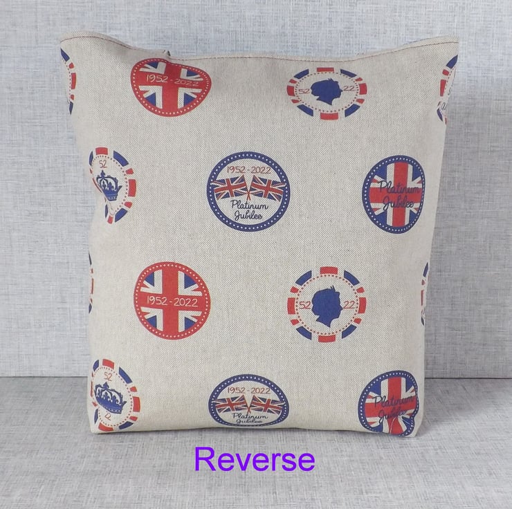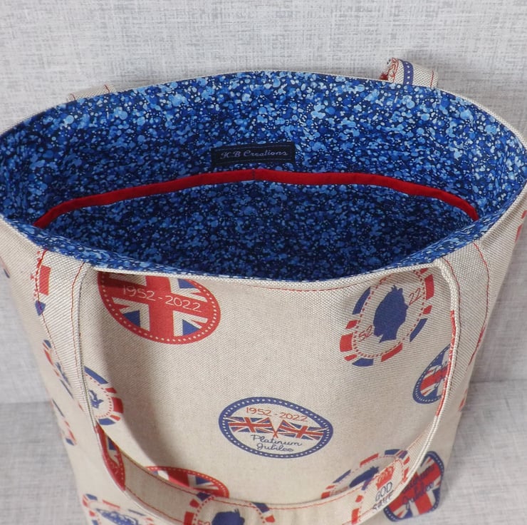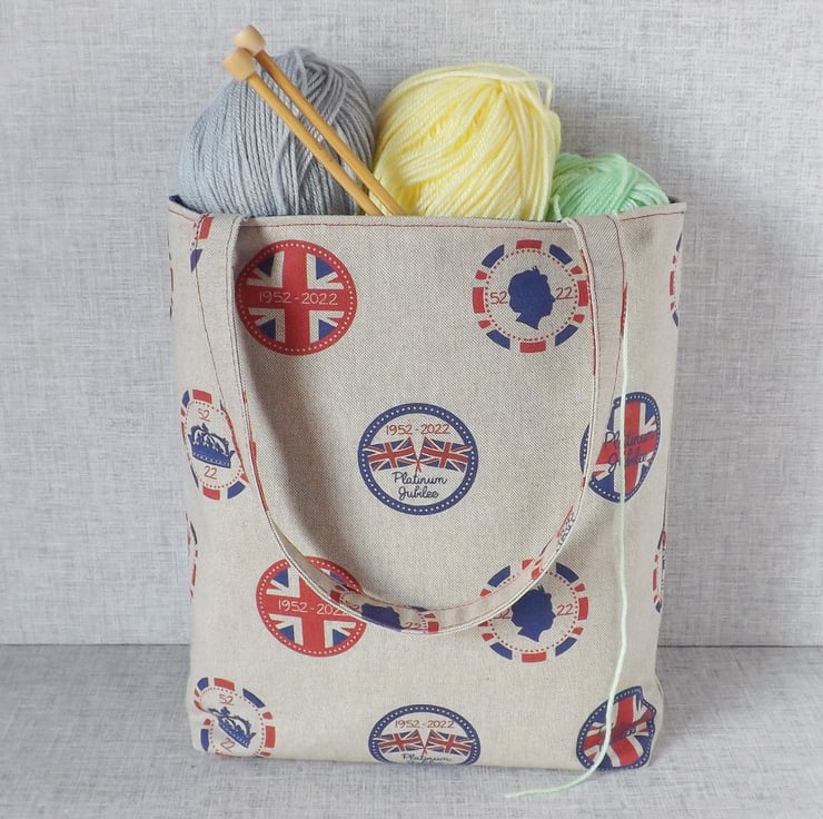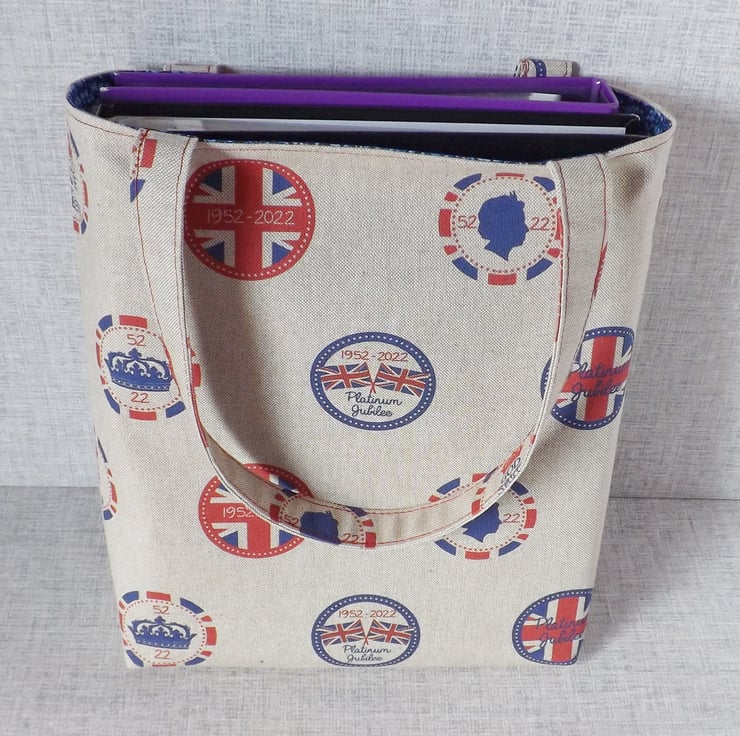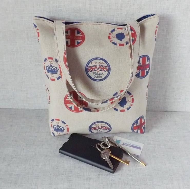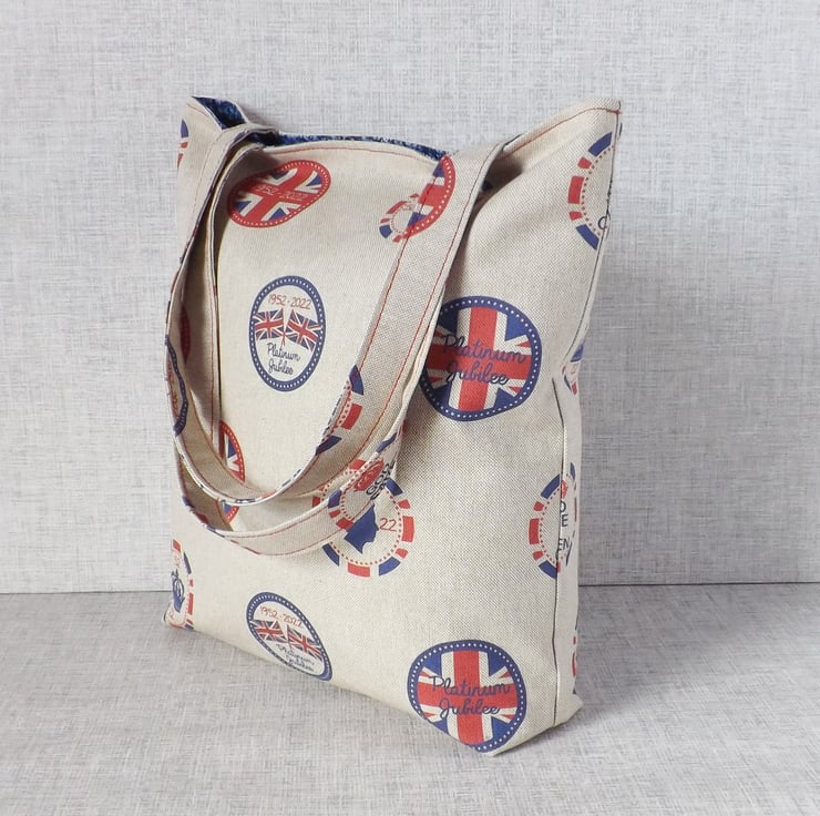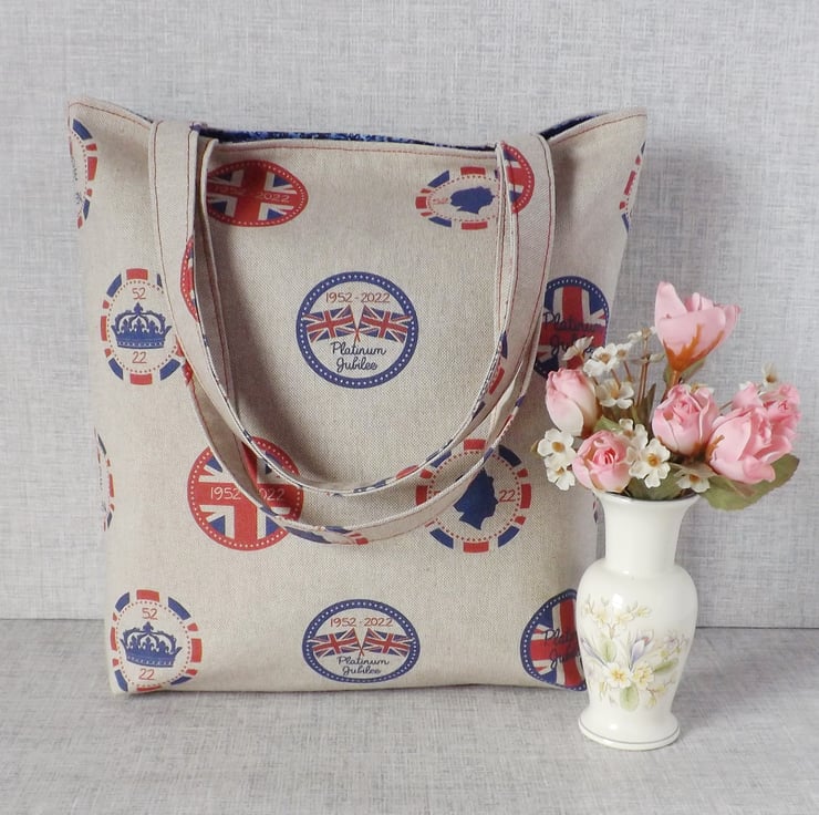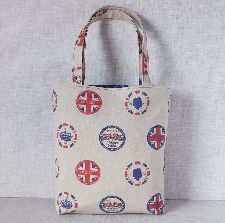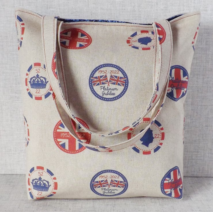A medium sized strong tote bag/shopping bag made from natural coloured cotton canvas fabric, with designs on it to celebrate the Queens Platinum Jubilee in blue & red.