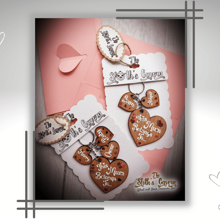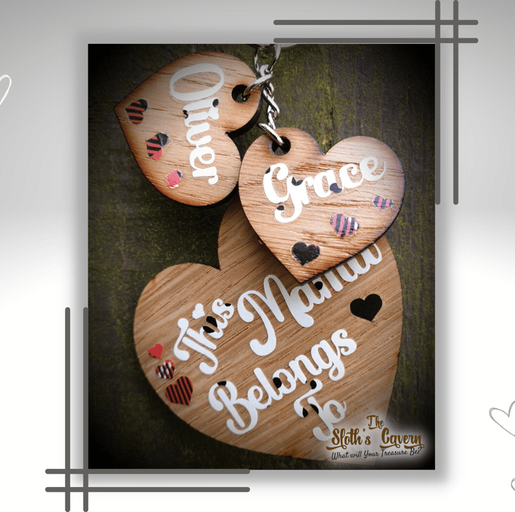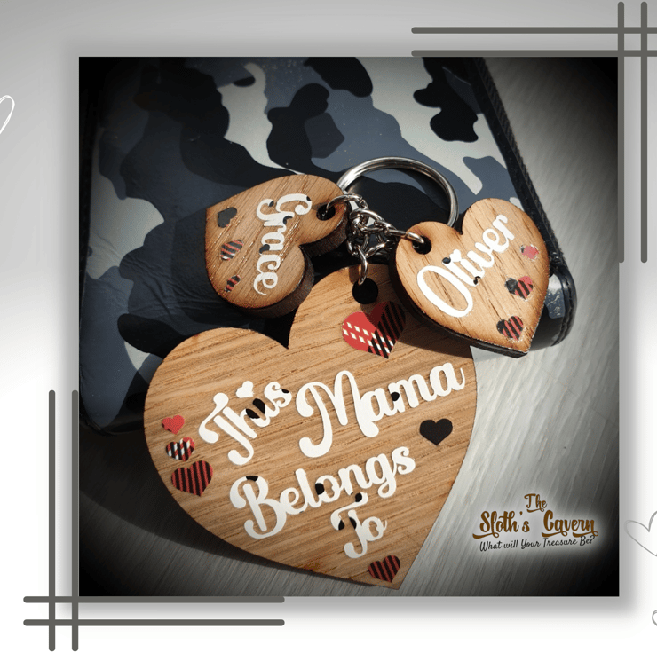 This lovely wooden keychain consists of 1 big heart which displays the message "This Mama Belongs To", and 2 smaller hearts which display the names.