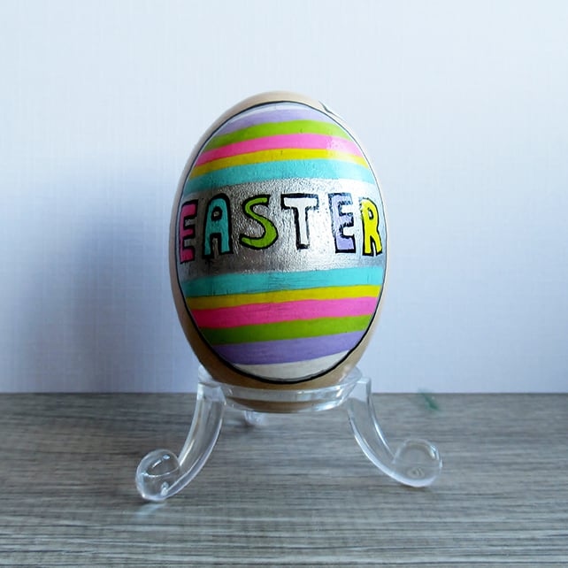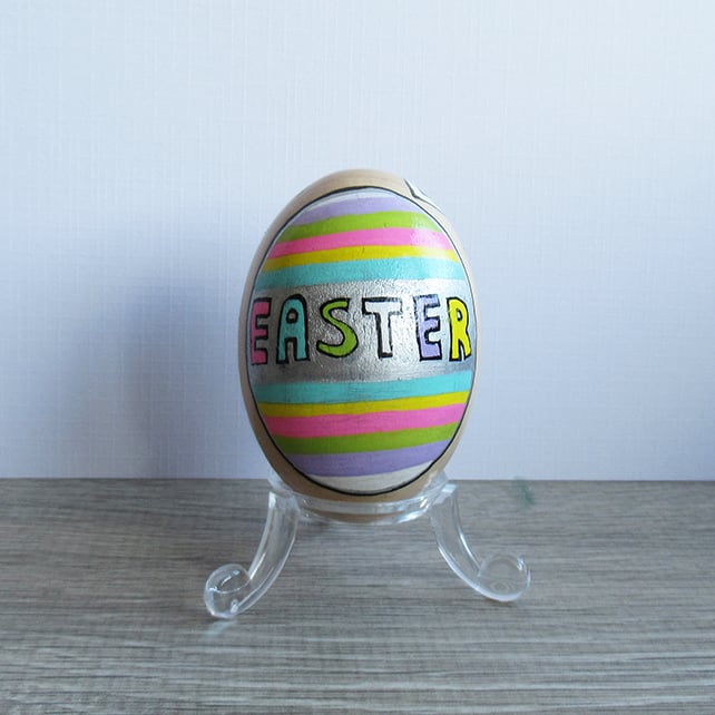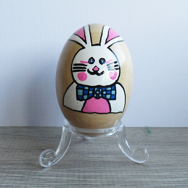 This Easter ornament has a fun Easter bunny on one side, it has been painted with acrylic paint in white and pink and a dapper blue checked bow tie has been added. On the reverse side it has a striped egg shape and at its centre is a silver band with the text 'Easter' in bright spring colours.