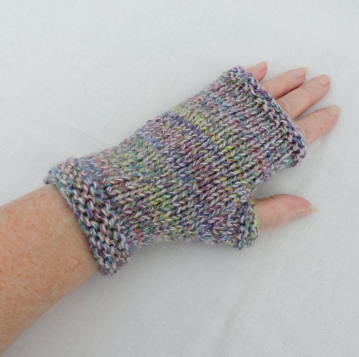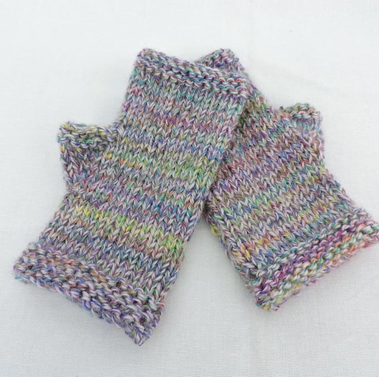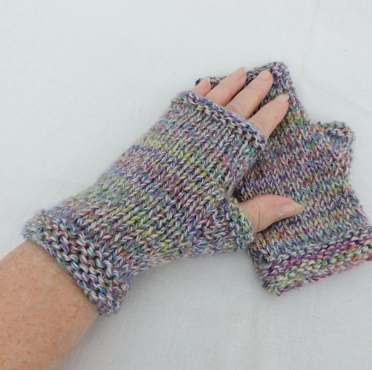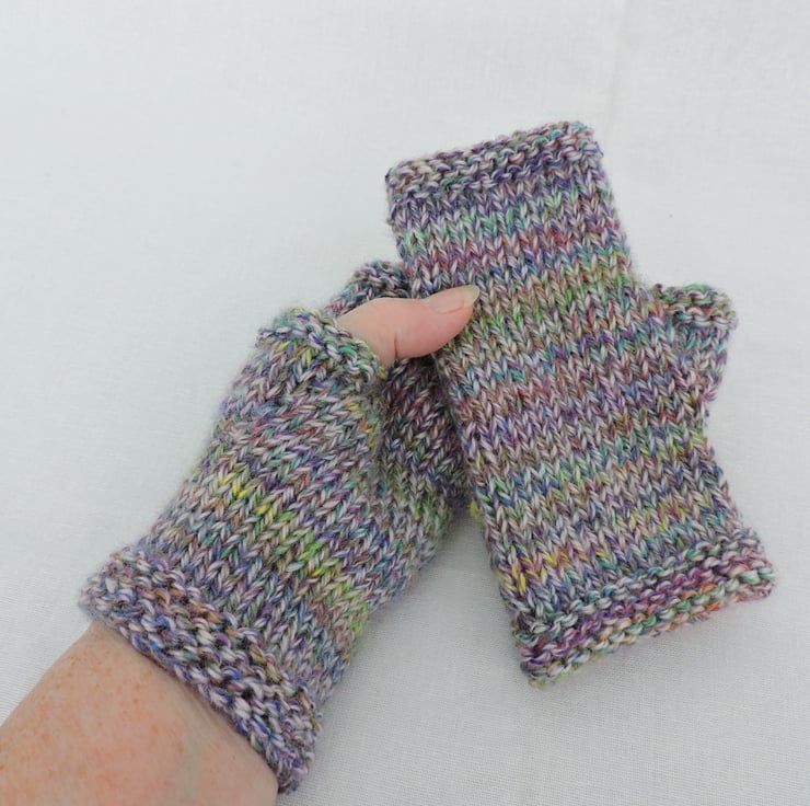I've knitted these colourful fingerless mitts in a multi tonal chunky acrylic yarn. They have a garter stitch cuff and top with a stocking stitch body. The colour is a marl yarn of purple, green, yellow, pink and cream. Beautifully soft and warm.