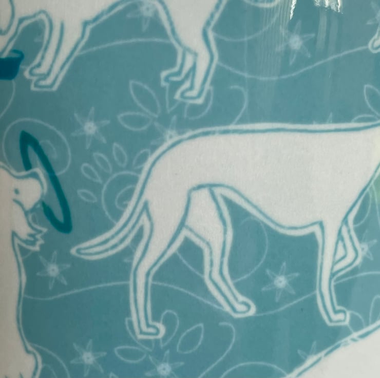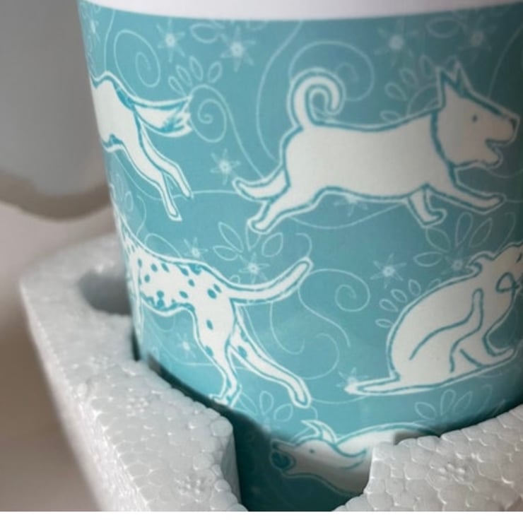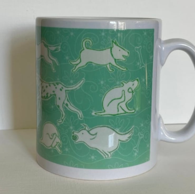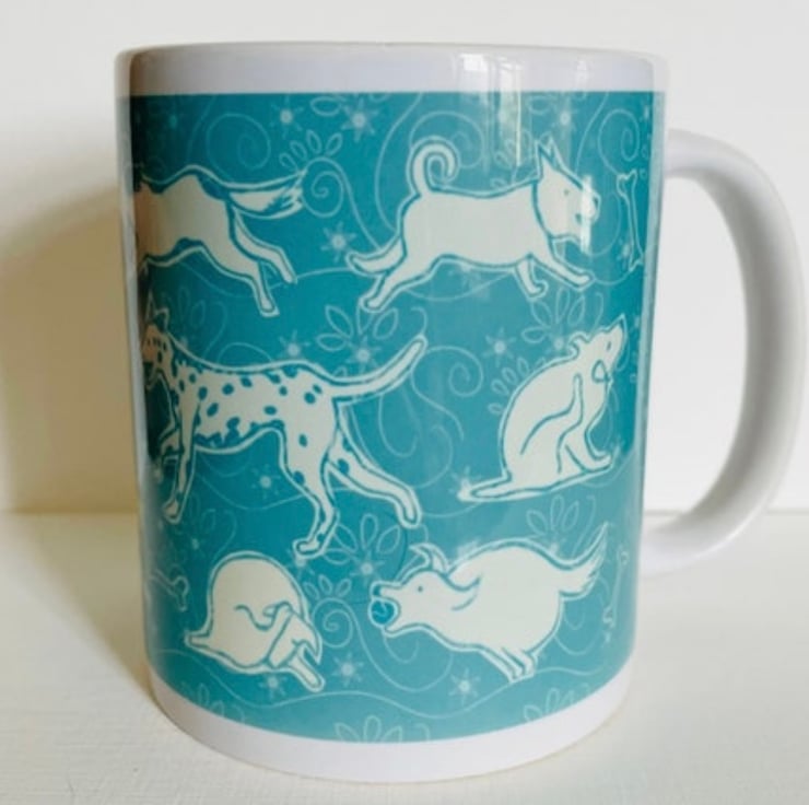 I love to sketch my dog and watching her and her dog friends at play inspired this mug.