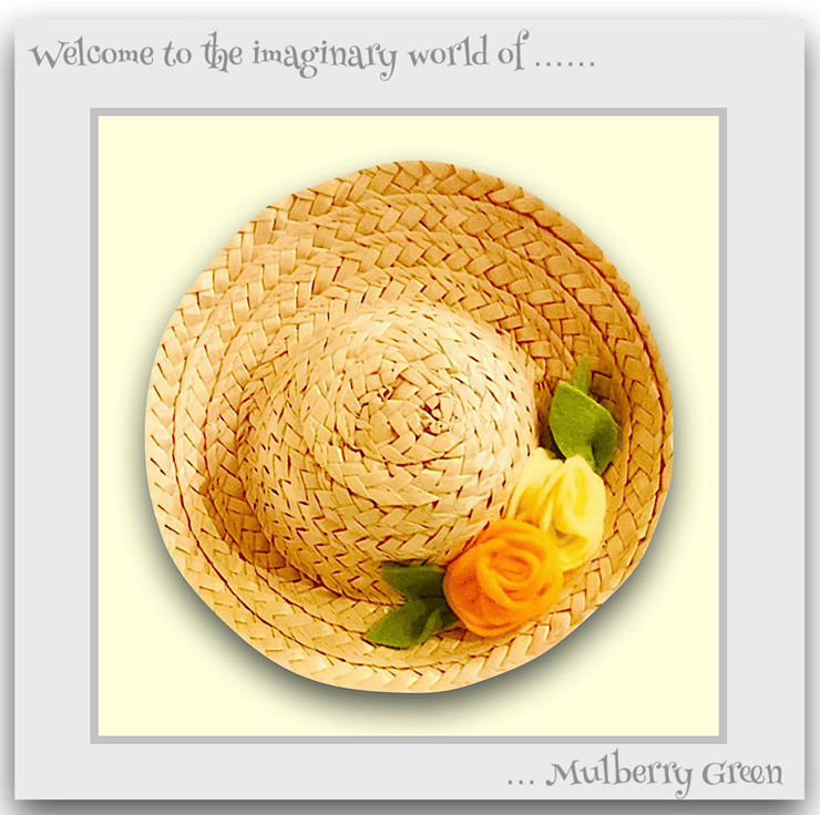 A smart straw sun hat trimmed with two hand rolled felt roses to fit the Mulberry Green characters. The hat looks lovely with the ‘It’s a Spring Thing’ collection.
