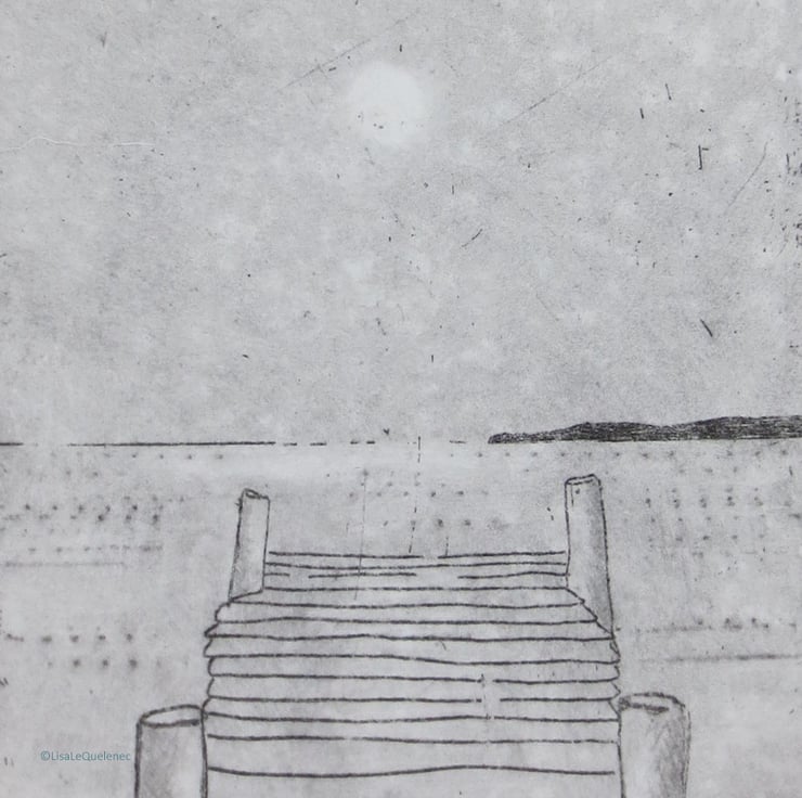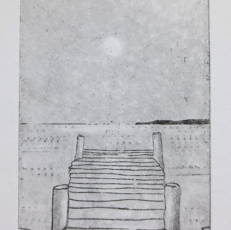 Original handmade limited variable edition etching print of a jetty at night with the moon reflected in the water. Printed in black ink this is the first print in the edition of 95 prints.