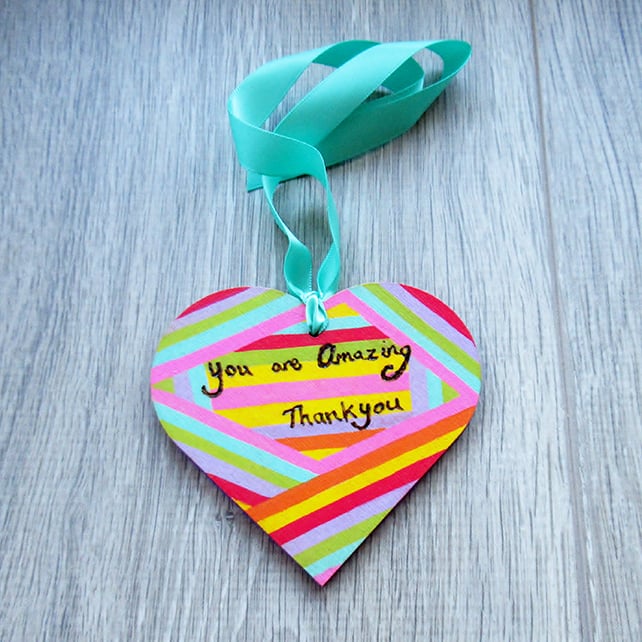 Hanging heart decoration. Wooden heart, featuring a colourful layered stripe design and pyrography added text ‘You are Amazing. Thankyou’