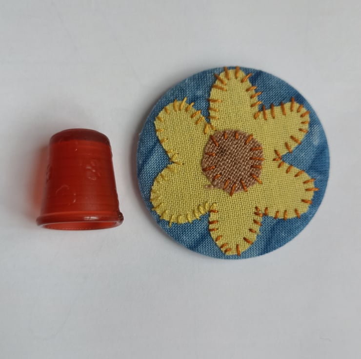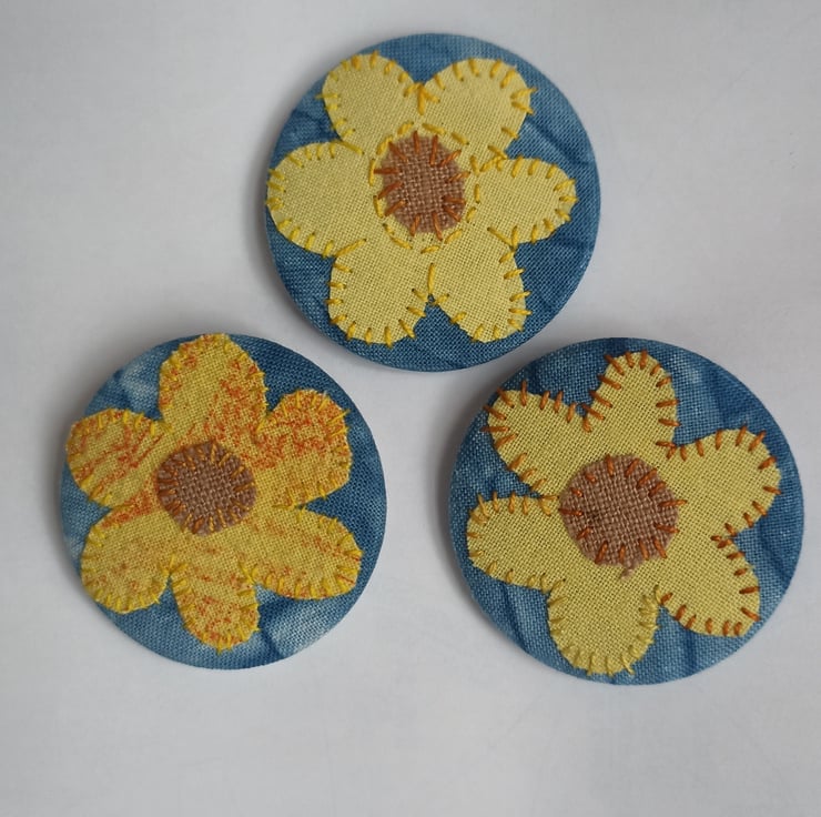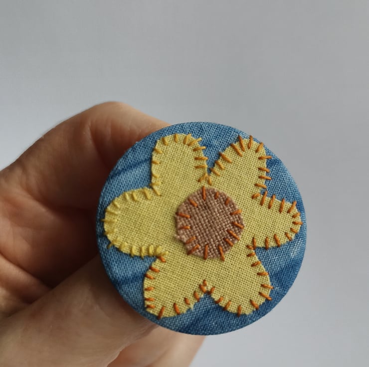 In response to the terrible news from Ukraine, I am making brooches featuring bright yellow sunflowers on a blue background. The colours of the Ukraine flag.
