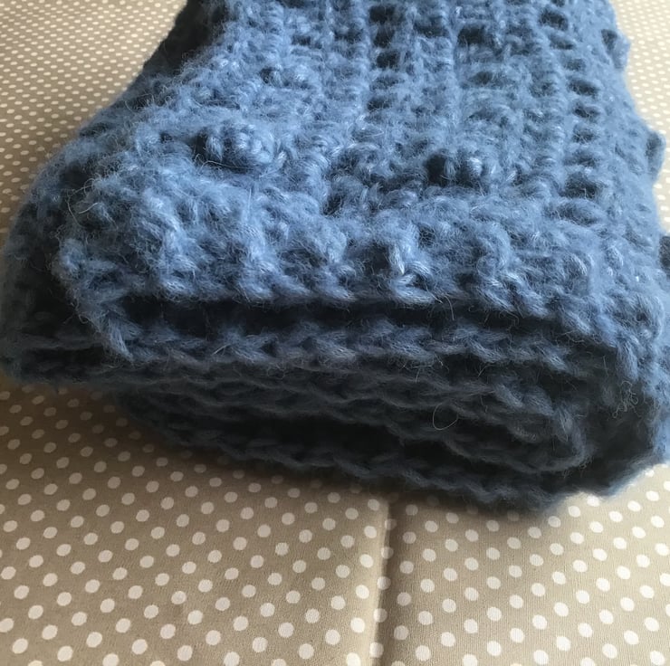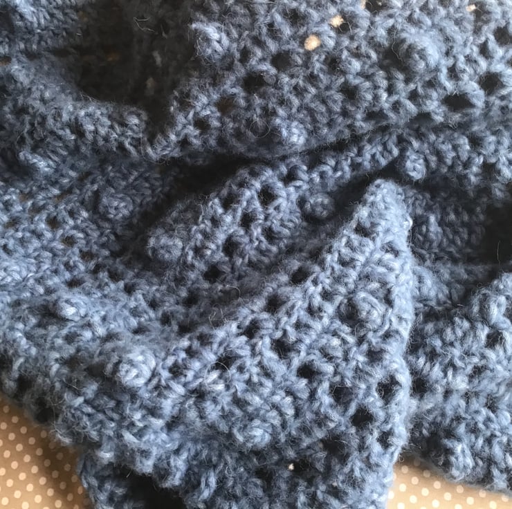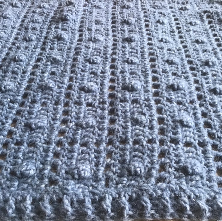 Featuring a bobble and filet crochet pattern with a ribbed border.