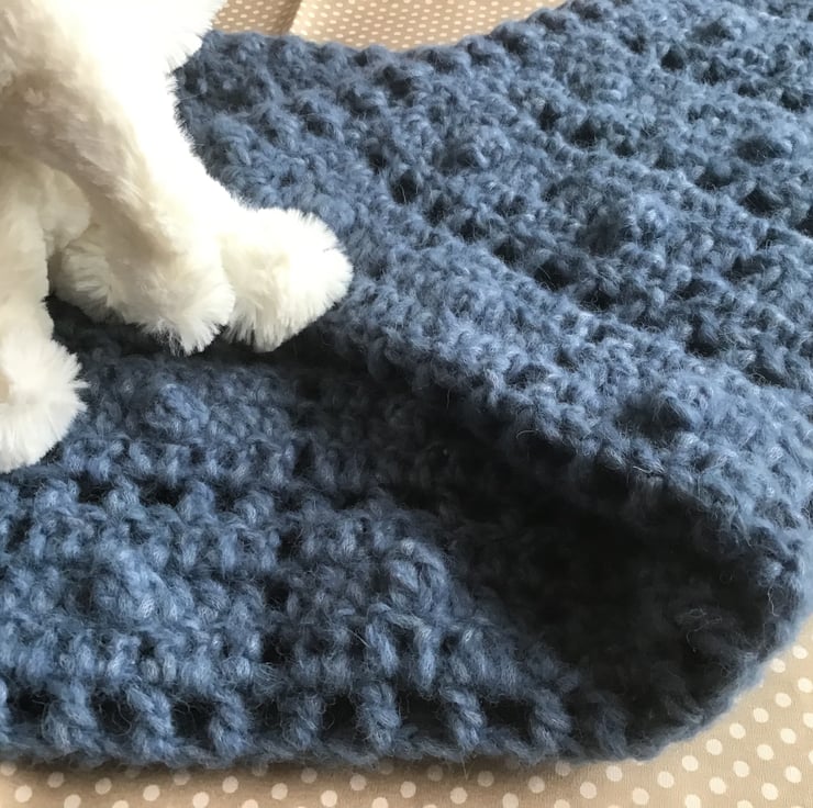 Crocheted baby blanket made in a luxury alpaca blend yarn.