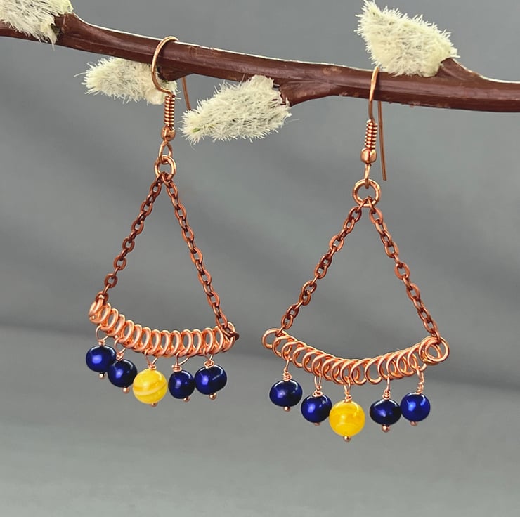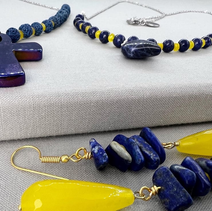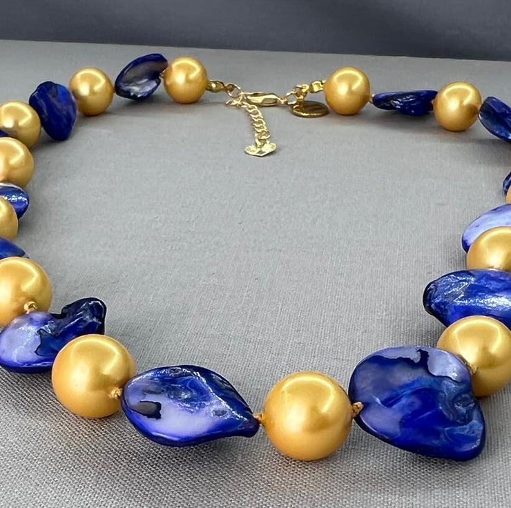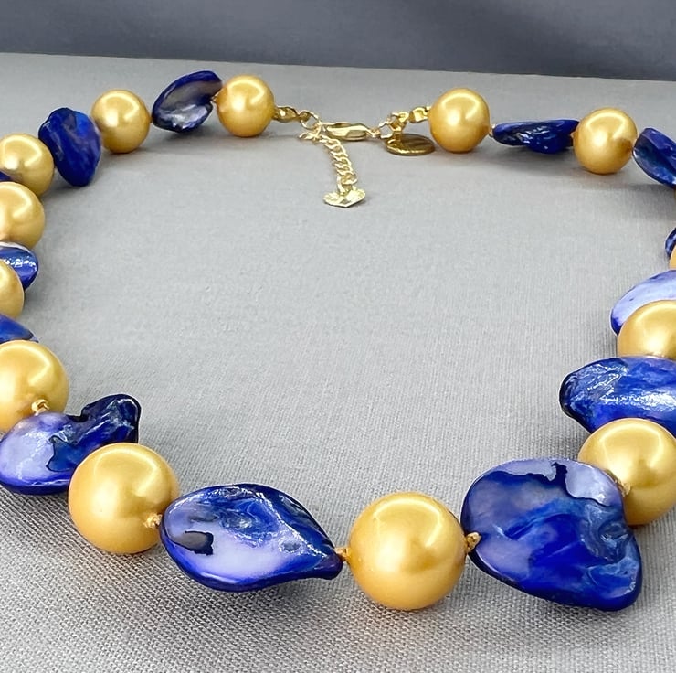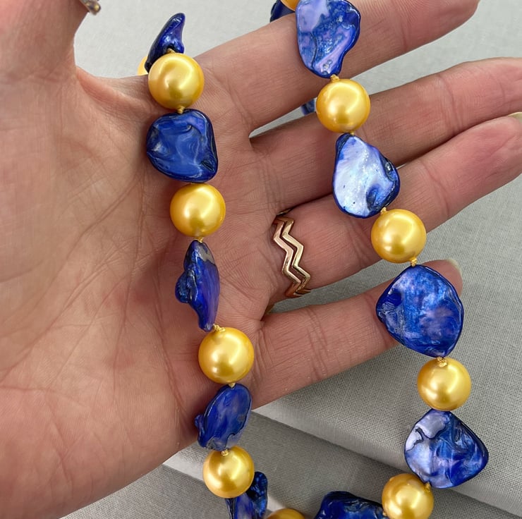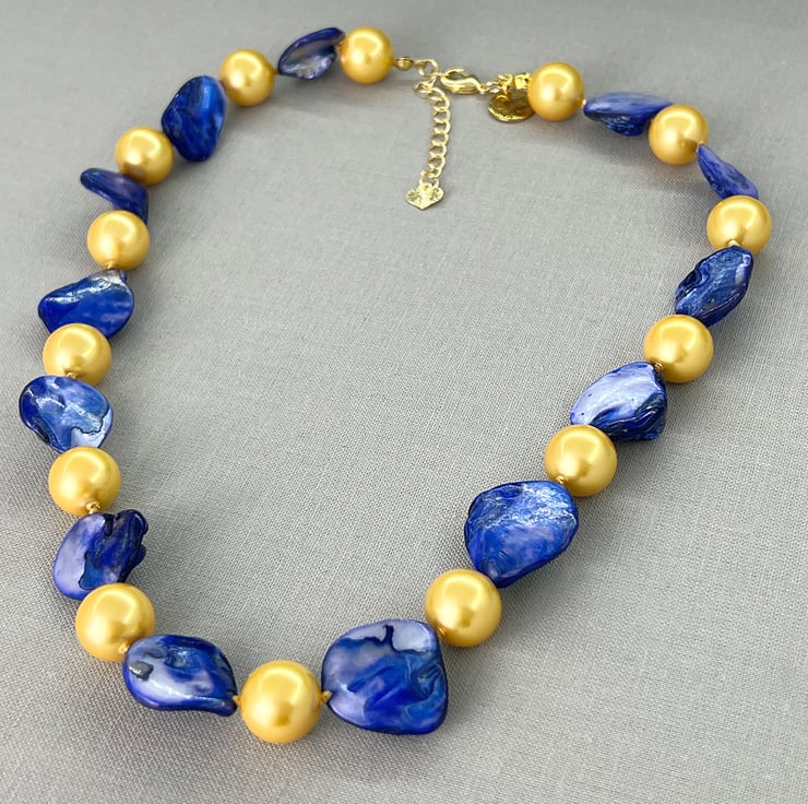 A gorgeous choker style necklace made up with yellow shell pearls and blue rustic shells which has been hand knotted and secures with a lobster style clasp with a 2 inch extender chain.