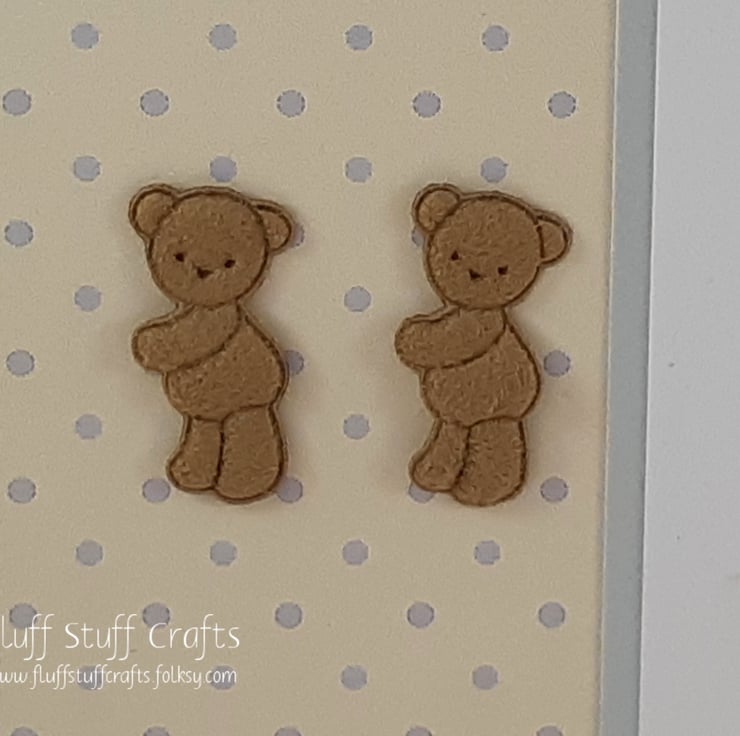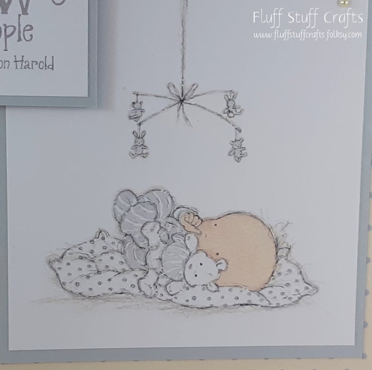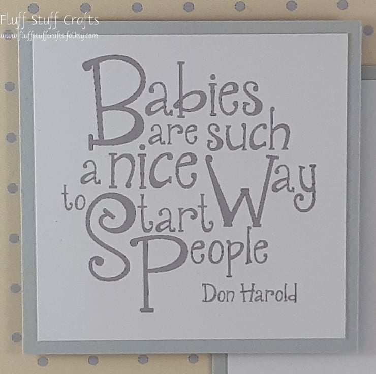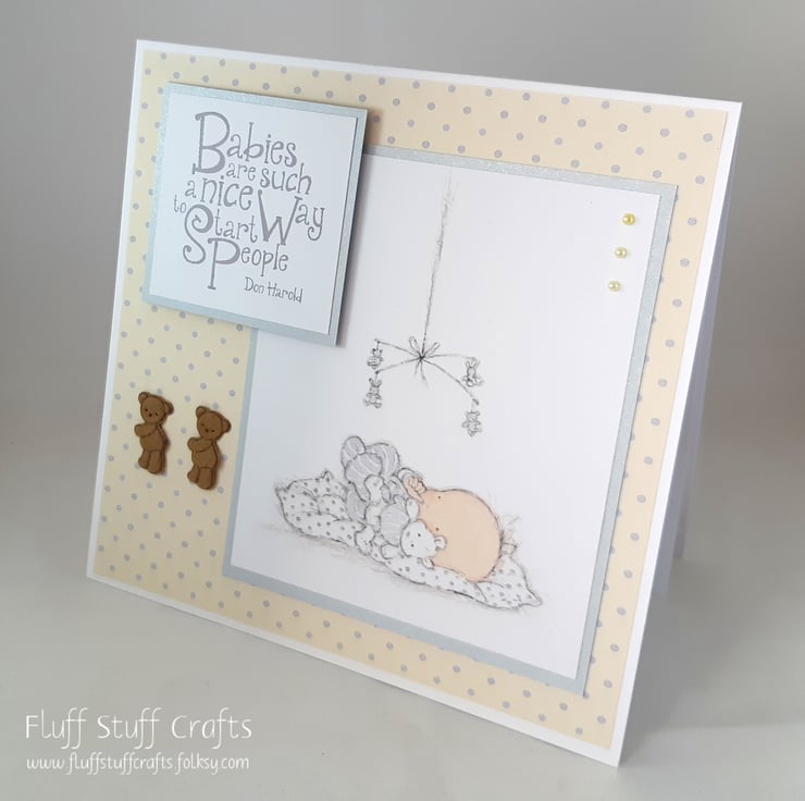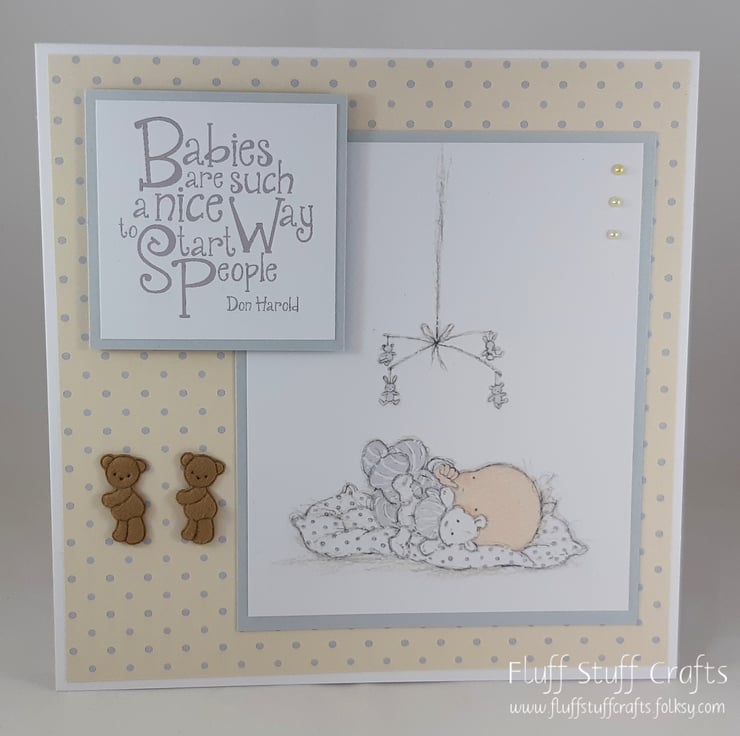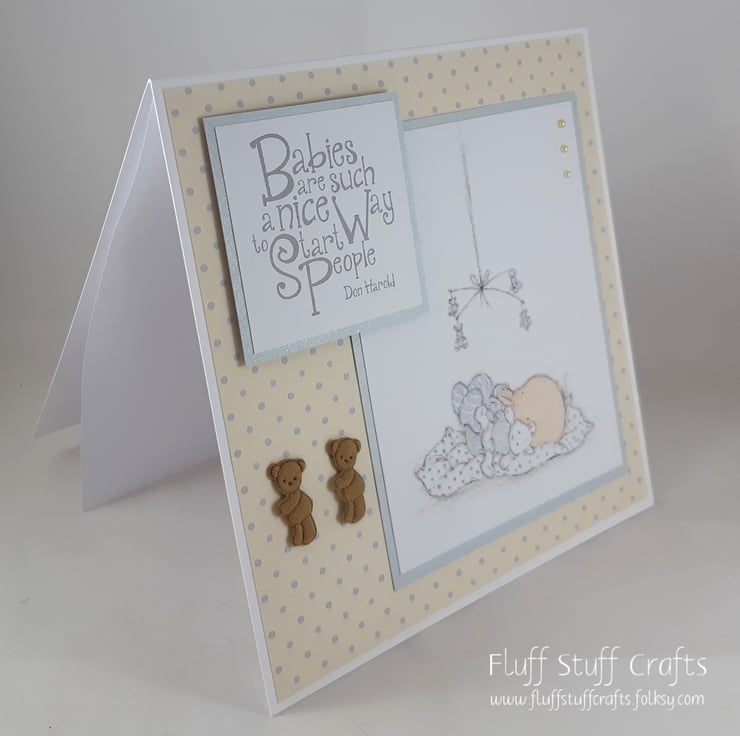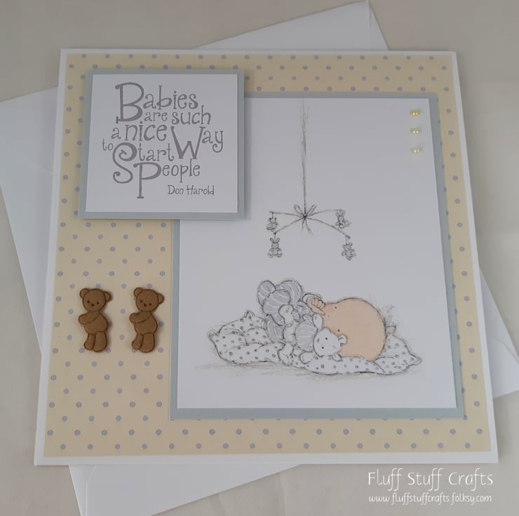 Square, new baby card in grey and cream, suitable for boys or girls. The card features a printed image of a baby lying below a mobile, cuddling a toy. The image and the quotation 'Babies are such a nice way to start people' have been mounted on to pale grey card over a cream and grey polka dot background. The card has been embellished with 2 small, brown felt teddies and three cream pearl gems.