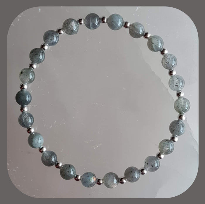 The Labradorite beads are about 5mm and the silver beads are 3mm. The bracelet is elasticated. It is best to roll it on and not pull.