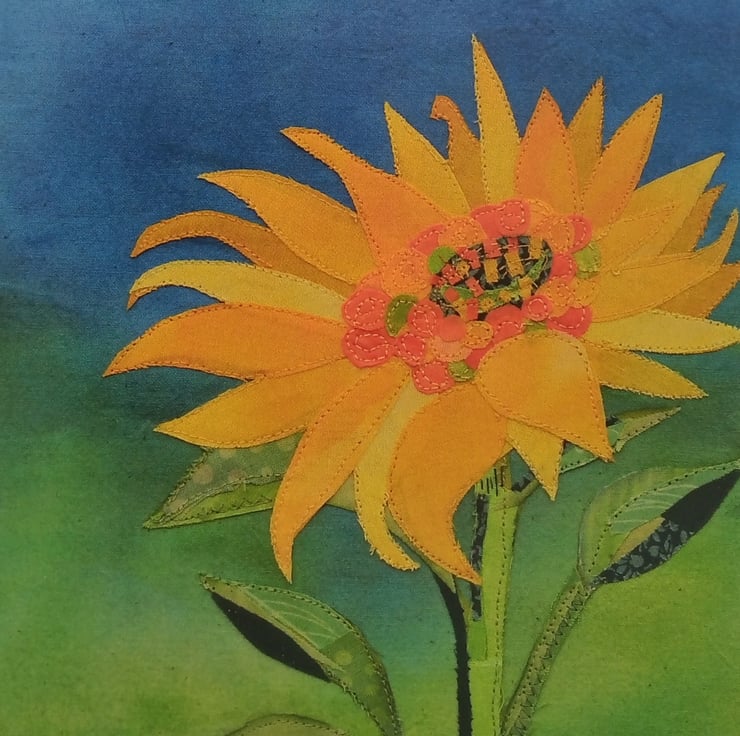Greetings card printed with my textile picture of a sunflower. The card measures 5x5 inches (12.5x12.5 cm) and is blank inside. Envelope included.