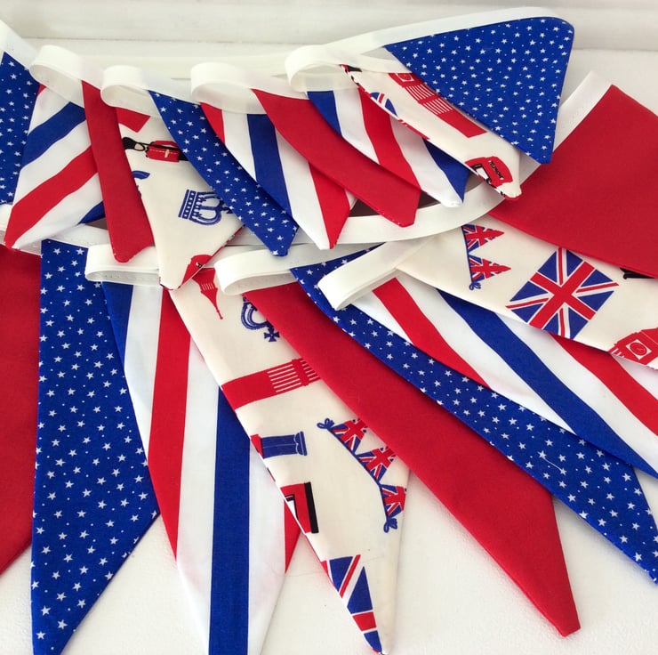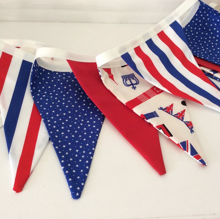 Celebrate this years Jubilee Celebrations bunting very patriotic for so many events, or for Dad's man cave this Fathers Day. The fabric has a mix of stars, stripes and Union Jack and London motifs. This set has 12 double sided flags 7.5 inches at the longest point and 5 inches at the widest point. The great thing about this bunting, come rain or shine, it can be popped in the washing machine, dried, ironed and back in use, so it will last for years to come.
