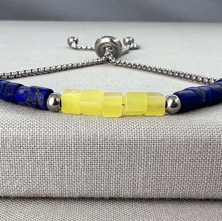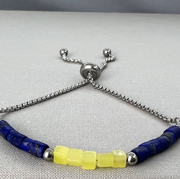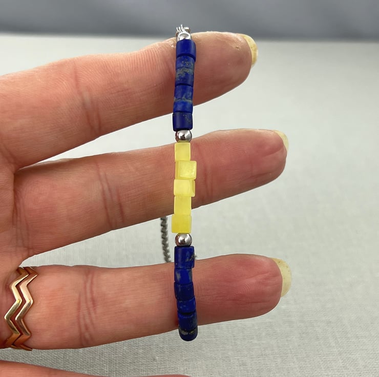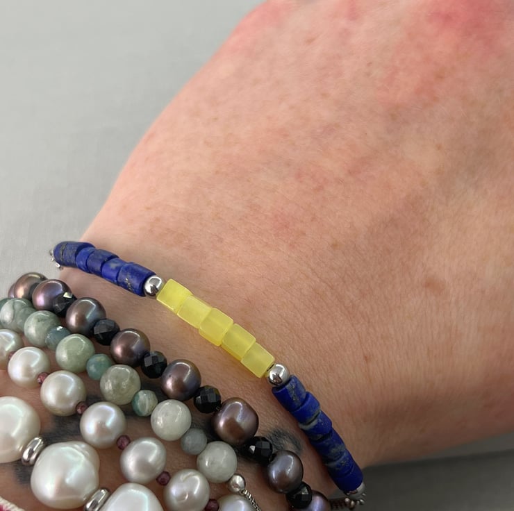 Here’s a unisex bracelet that’s so simple to wear. This is my lapis lazuli and serpentine slider bracelet. This will never tarnish as it’s stainless steel.