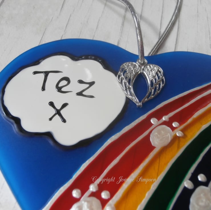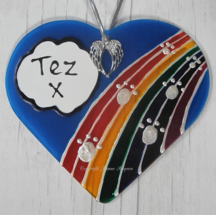 All sun catchers are hand painted by me from my own design. As each one is hand painted they are all as individual as your pet. A single name, upto seven letters, can be added to the cloud and the paws going over the bridge are pearl coloured. Finished with an angel wings charm. Hanging thread colour may vary.