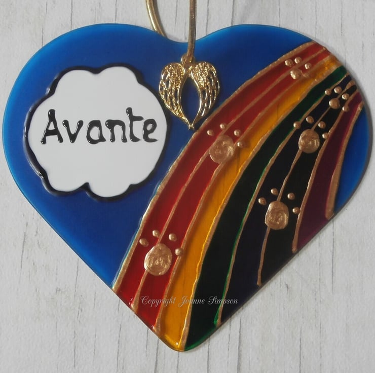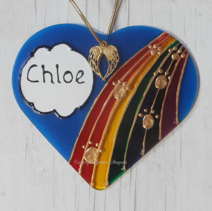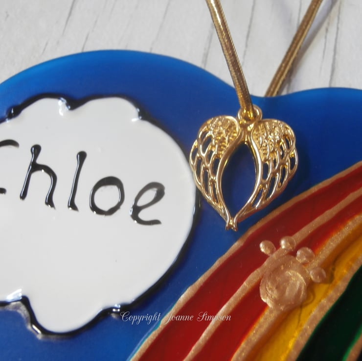 All sun catchers are hand painted by me from my own design. As each one is hand painted they are all as individual as your pet. A single name, upto seven letters, can be added to the cloud and the paws going over the bridge are gold coloured. Finished with an angel wings charm. Hanging thread colour may vary.
