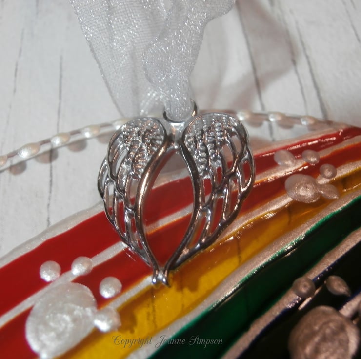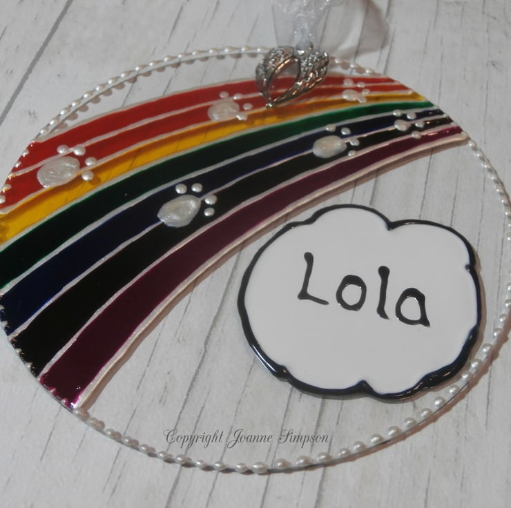 All sun catchers are hand painted by me from my own design. As each one is hand painted they are all as individual as your pet. A single name, upto seven letters, can be added to the cloud and the paws going over the bridge are pearl coloured. Finished with an angel wings charm and an organza ribbon.
