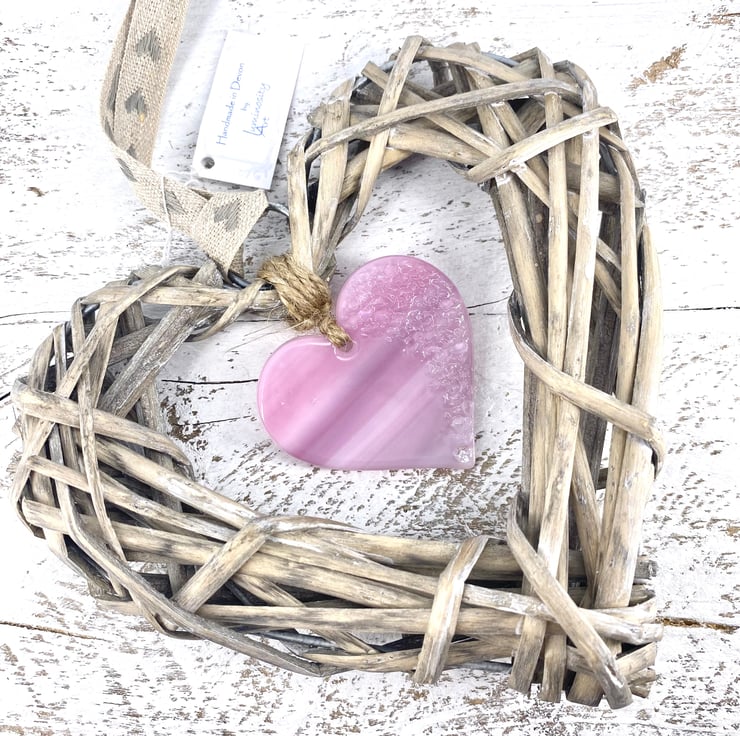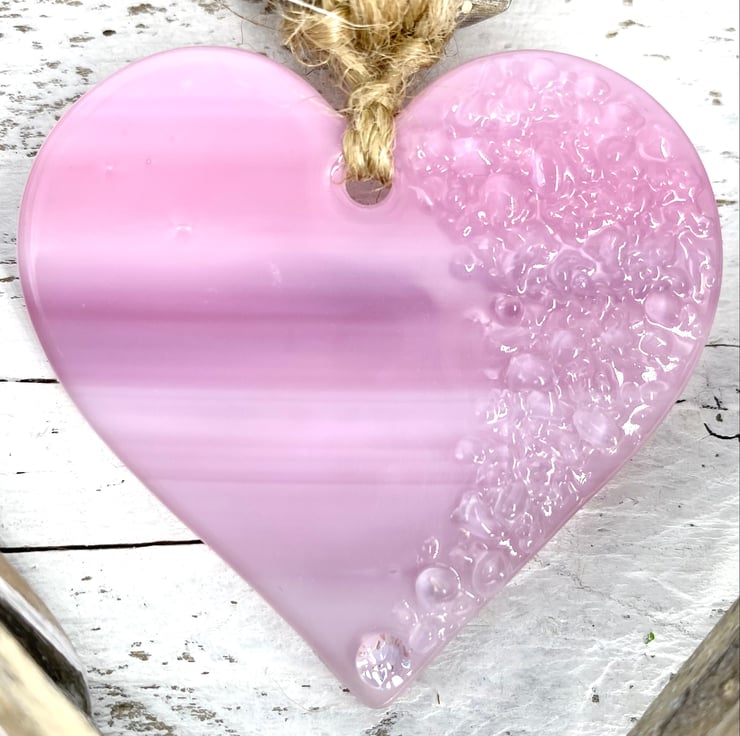 A gorgeous heart made from wispy pink artglass - one side is textured with crushed glass and there is a silver bead fused on the tip because we all love a bit of sparkle!