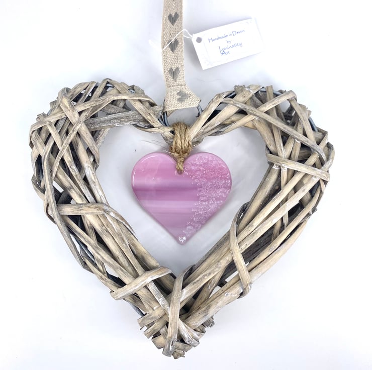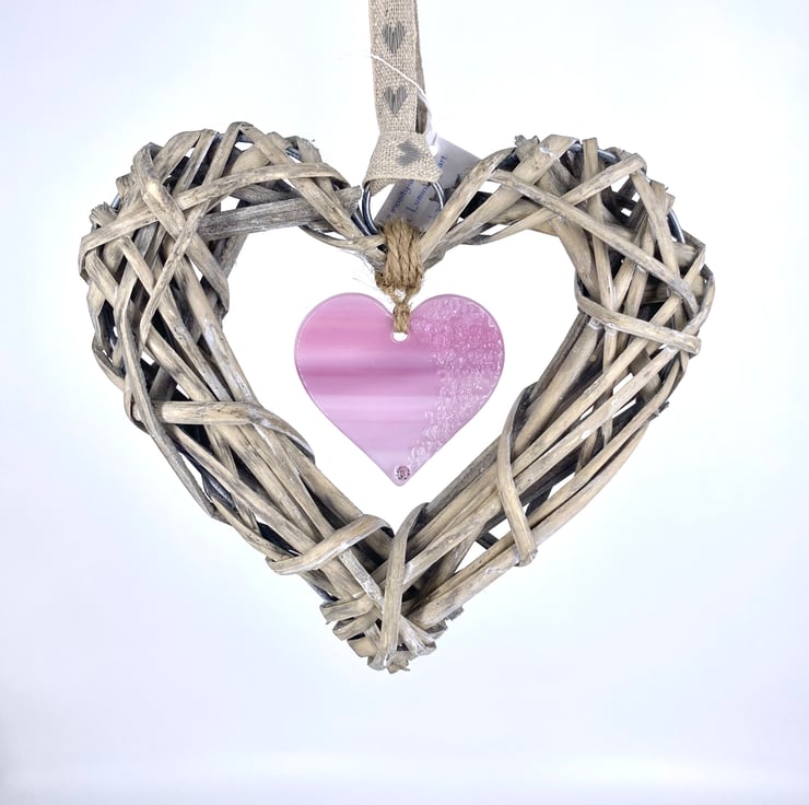 It is suspended in the middle of a wicker heart and has been finished with a length of coordinating gingham ribbon.