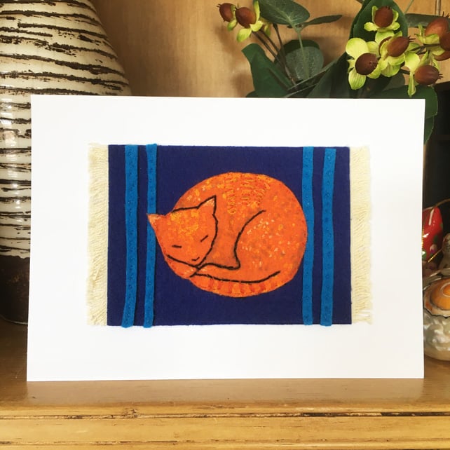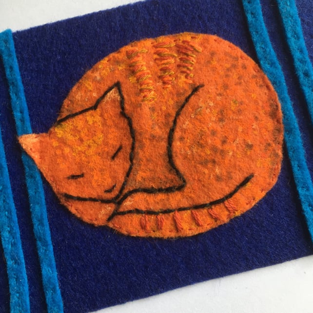 The mat is made from stiff felt with added light blue stripes and tasselled edges. I've used embroidery thread and acrylic paint to add colouring to the marmalade cat.