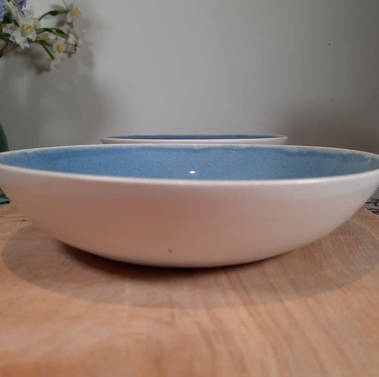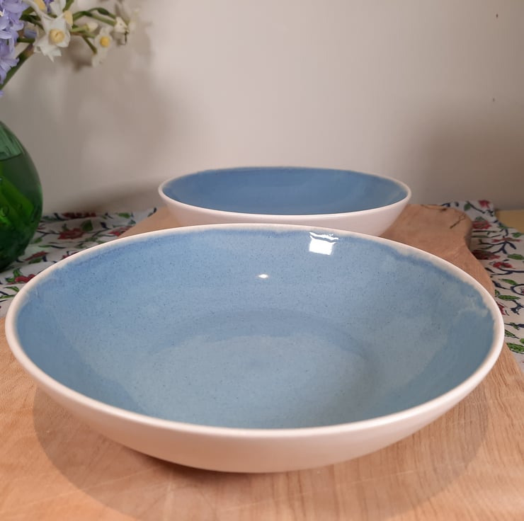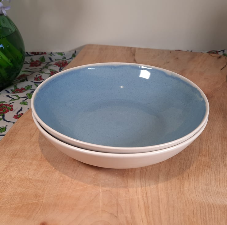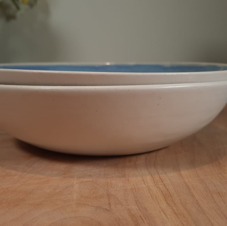 A hand thrown pasta bowl, glazed with glossy grey blue on the inside and satin white on the outside and rim.