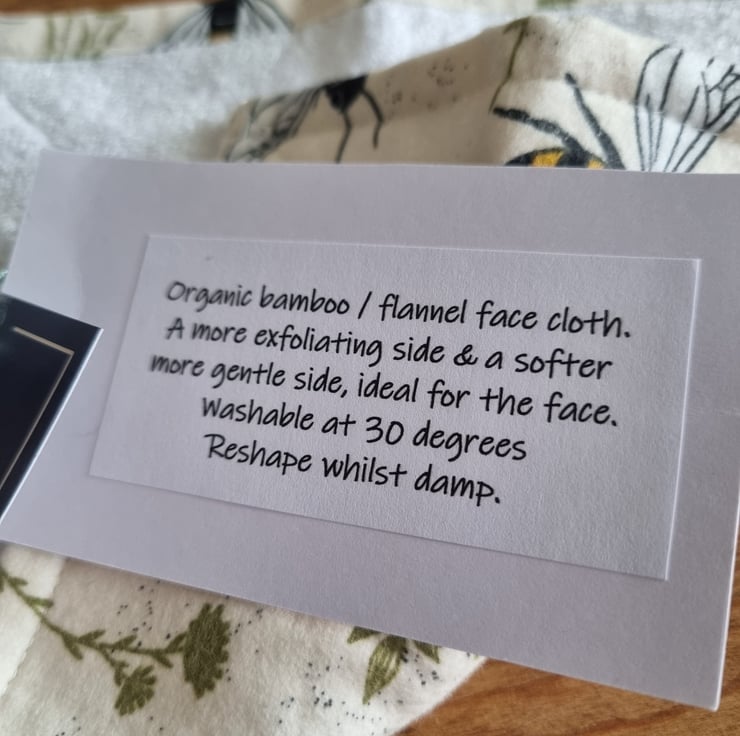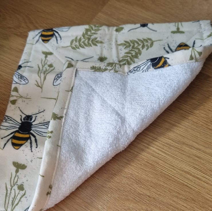 One side is softer 100% cotton printed flannel ... these are a bee and Fern design on a cream background. The reverse is bamboo towelling for a more exfoliating feel.