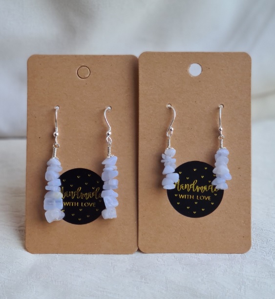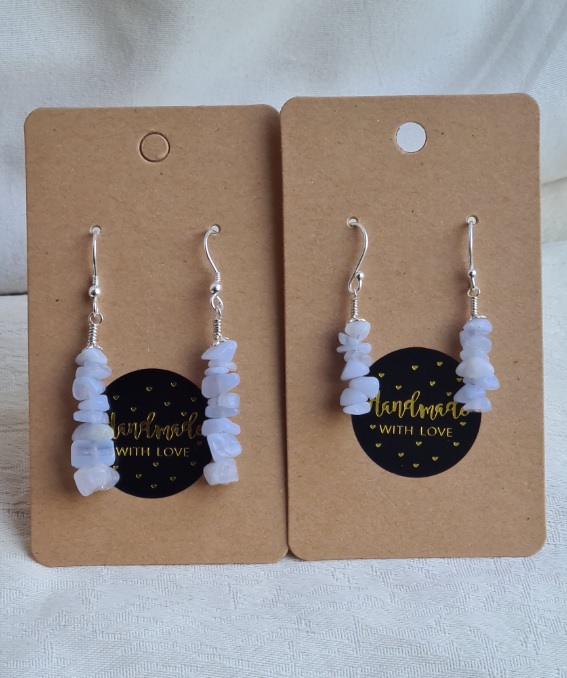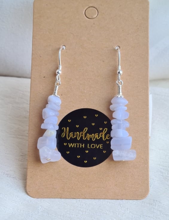 Earring length is approx 5cm long from the top of the ear wires to the bottom of the beads. The gemstone chip beads are Blue Lace Agate chips on thin Sterling Silver Headpins, making these a beautiful and elegant pair. The ear wires are Sterling Silver ball and coil style.