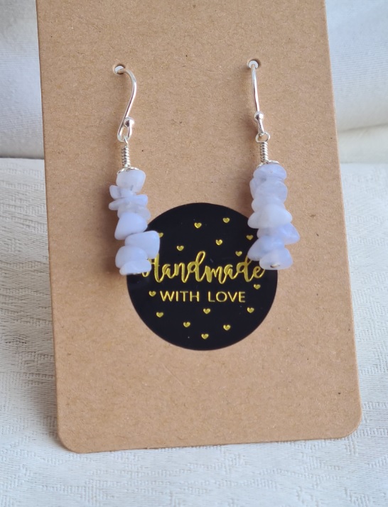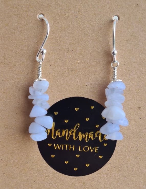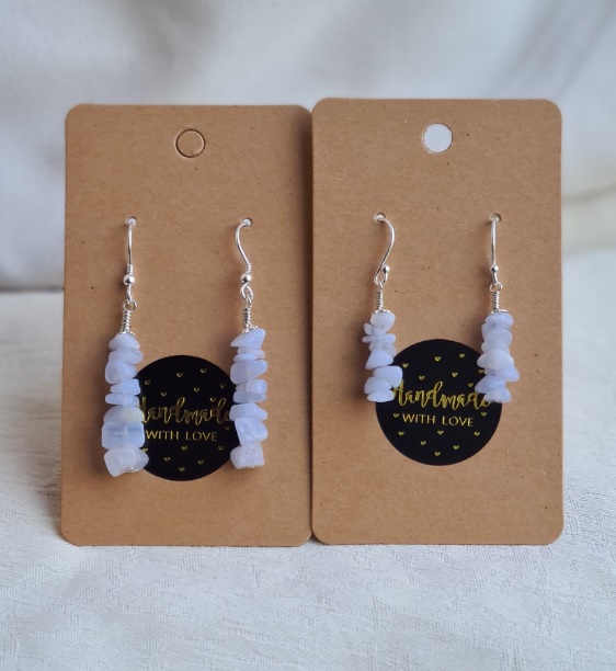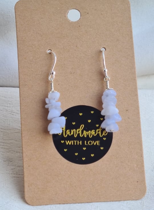 Earring length is approx 3.5cm long from the top of the ear wires to the bottom of the beads. The gemstone chip beads are Blue Lace Agate chips on thin Sterling Silver Headpins, making these a beautiful and elegant pair. The ear wires are Sterling Silver Hooks.