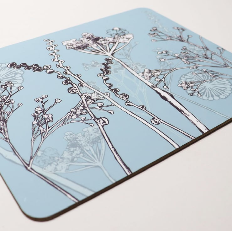 A set of 4 Unisub hardboard placemats with a high gloss finish featuring Clare's cow parsley and seedhead design printed in a soft blue and grey. Sandstone ceramic coasters are also available in the same design.