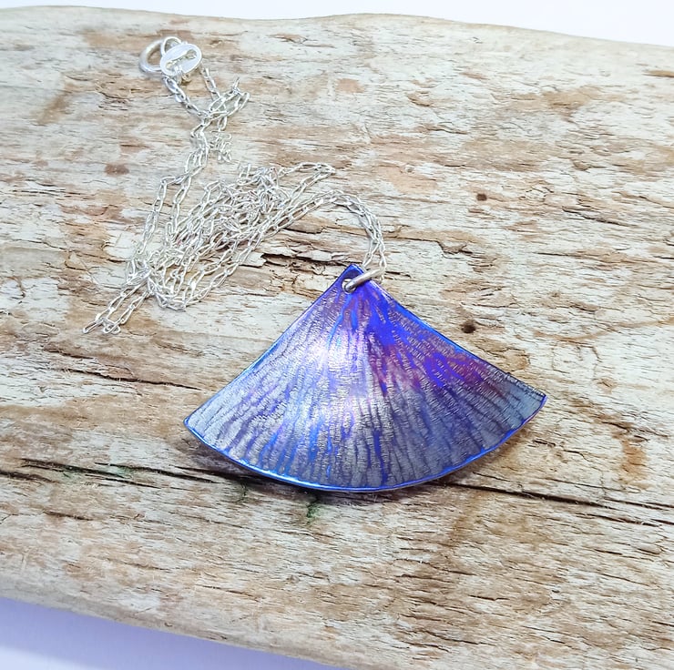 This beautiful pendant reminds me of a flower petal and I have made it by hand sawing the shape from titanium sheet then hammering it to create an interesting texture. I have then domed it to create shape before colouring.