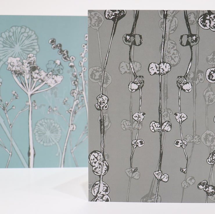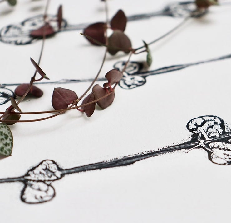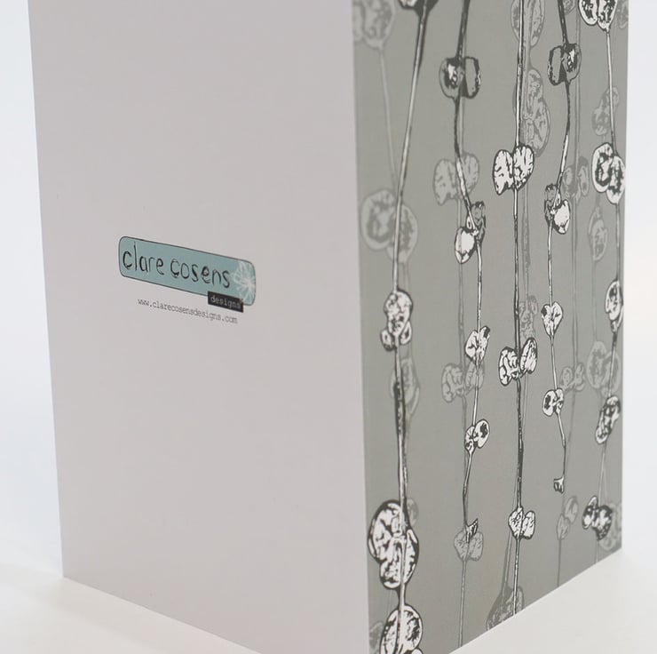 This collection features my favourite house plant - String of hearts. During lockdown I plucked up the courage to begin growing flowers and plants at home. I have a reputation for killing any plant in sight. With the help of a local florist, they taught me how to nurture and grow these trifling beauties. This design originated from a series of one-off Gelli plate prints, I then scanned and layered my prints using digital techniques to create the card design.