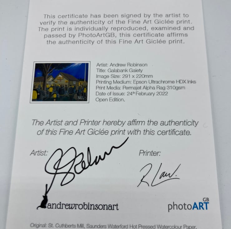The framed print comes with a 'Certificate of Authenticity' which documents the details of the original painting and the art print. The Certificate of Authenticity is affirmed with a signature from both myself (the artist) and the printer.