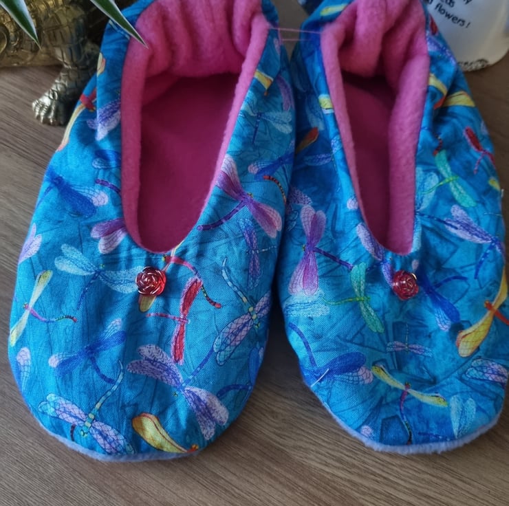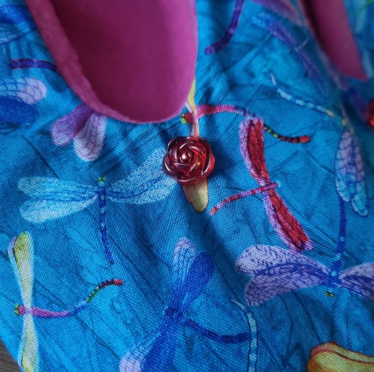 This pair are a lovely shade of turquoise with a multi coloured dragonfly print, pink lining and blue sole compliment the mix of colours. Trimmed with a rose shaped button.