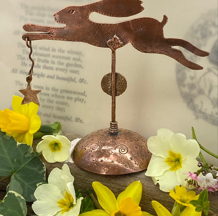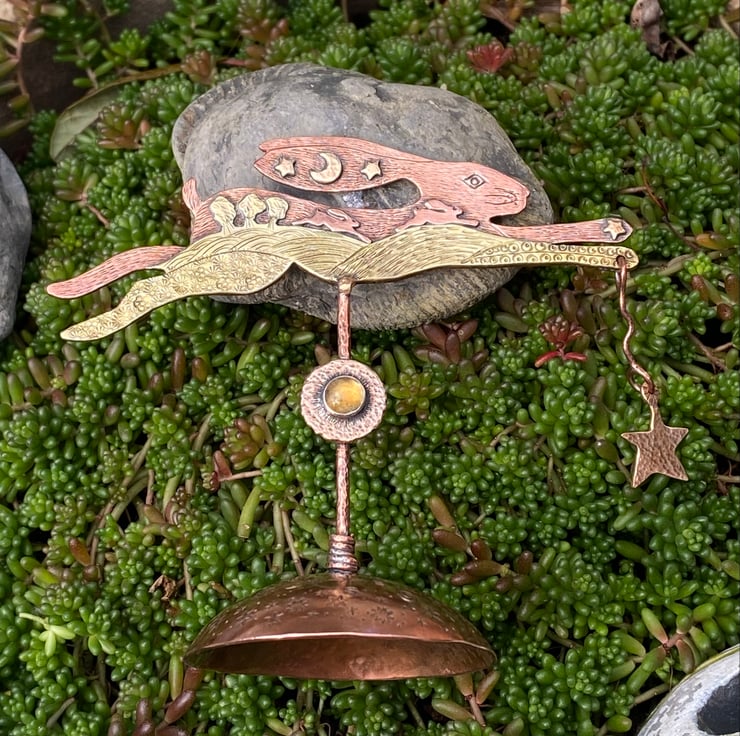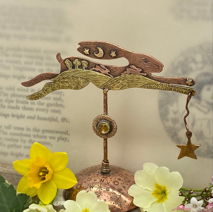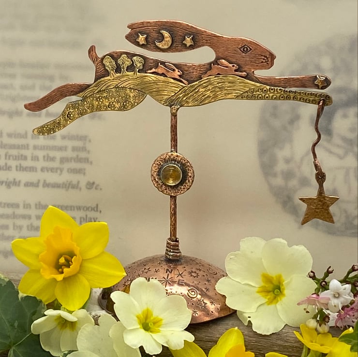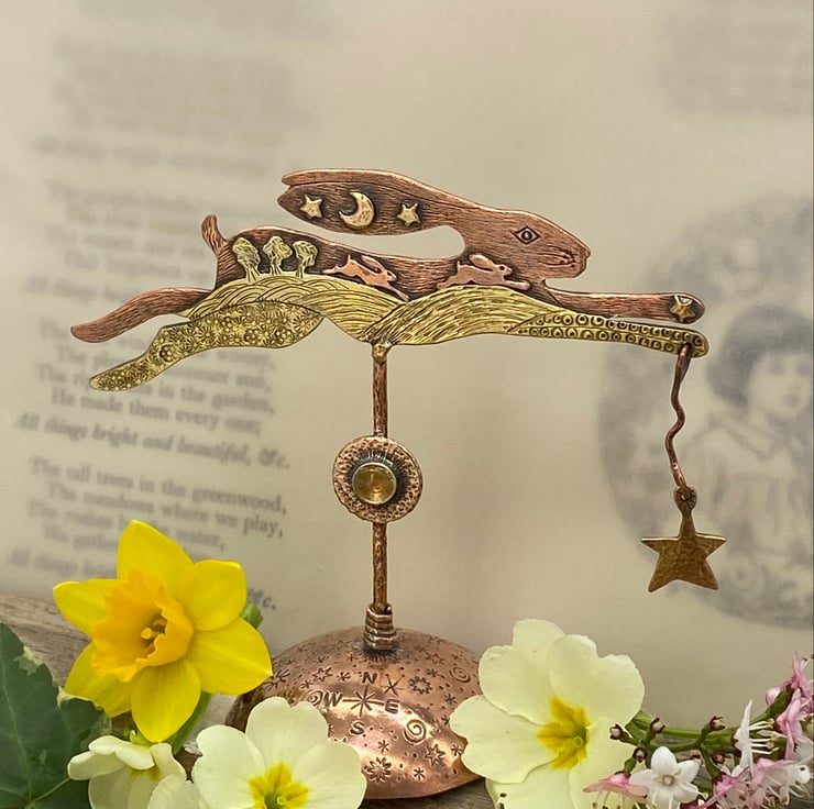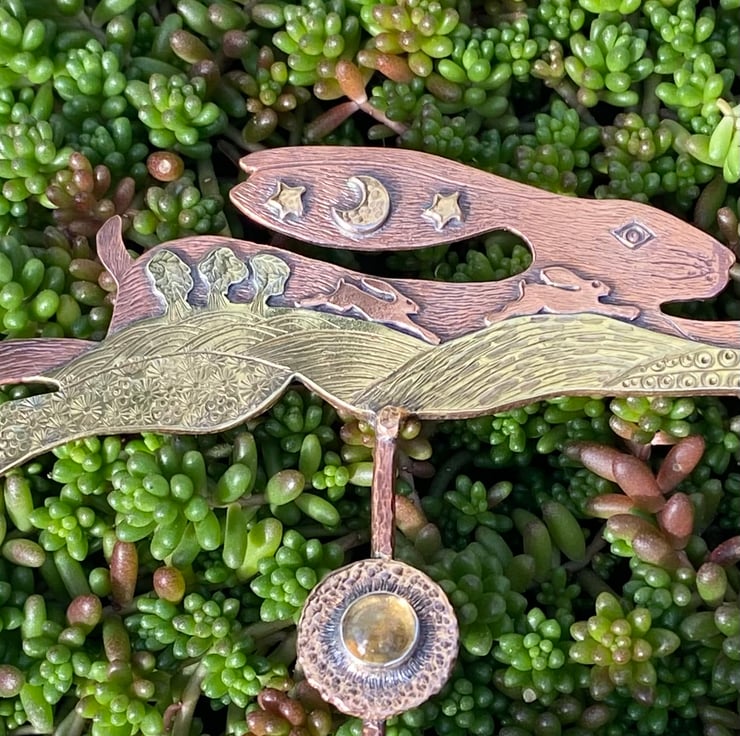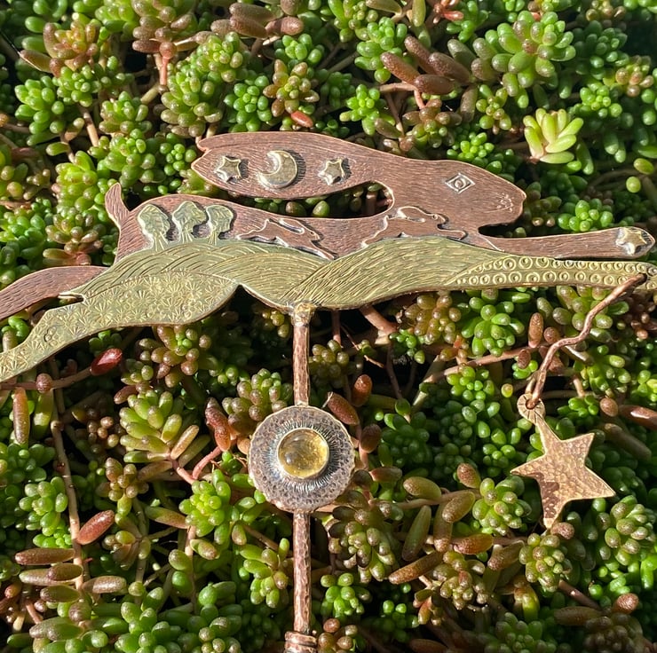 Copper & Brass Hare with gilding metal. A landscape hare influenced by my love of hares, wildlife and nature. Set with a citrine and with an oxidised finish.