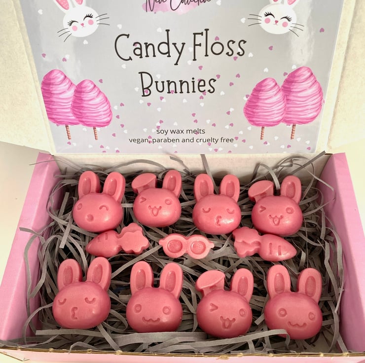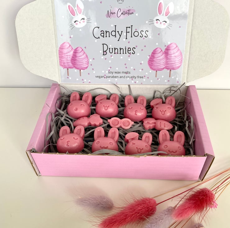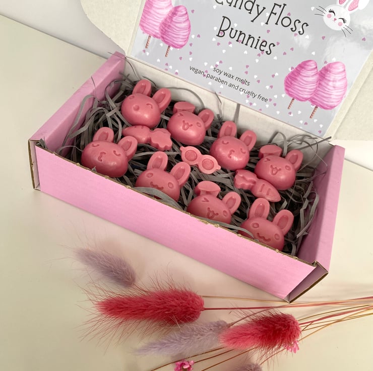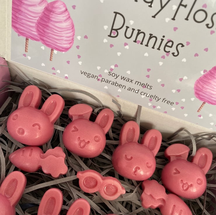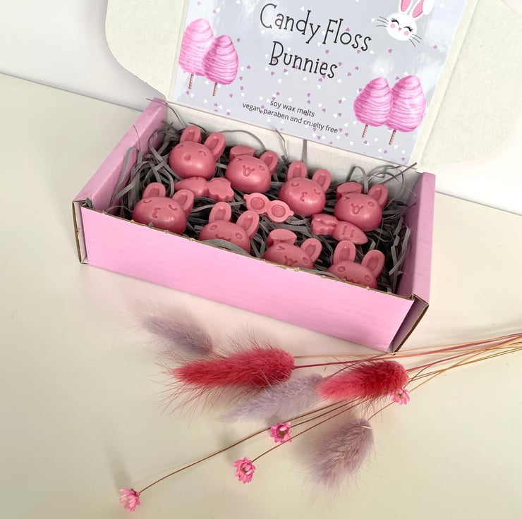 8 Bunny wax melts in Candyfloss fragrance. Highly scented and very cute.