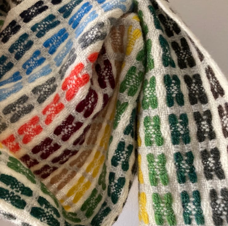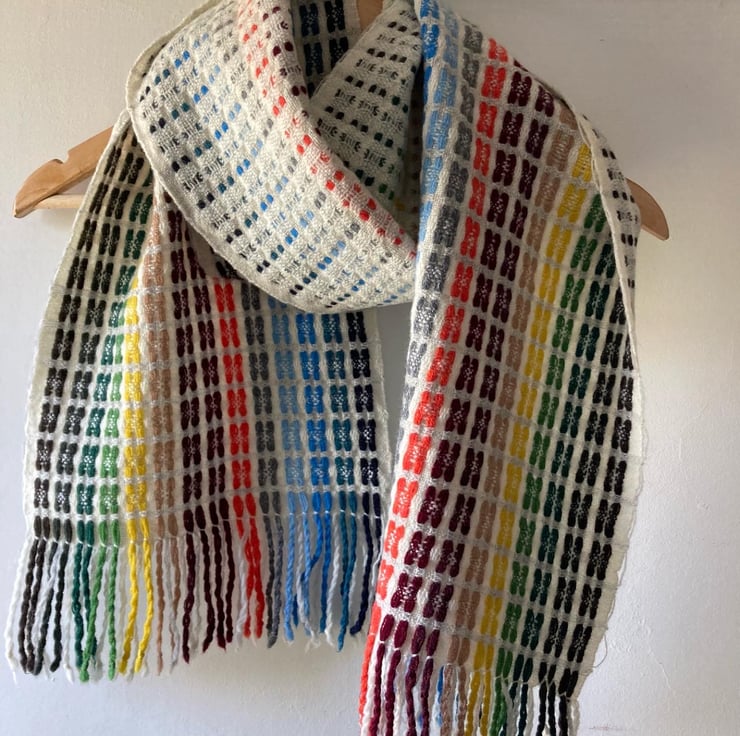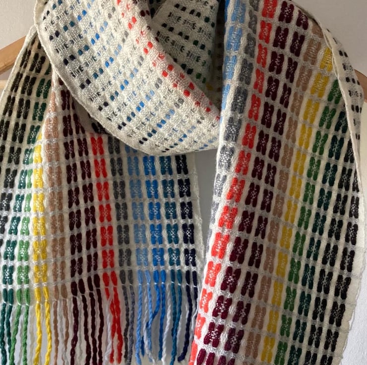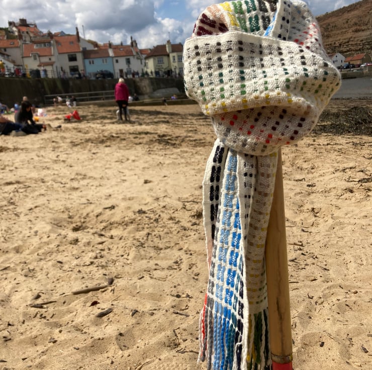 A super soft handwoven lambswool scarf in 16 shades. Woven in deflected doubleweave producing a light and airy double-sided scarf. The colours are carried in stripes in the warp. Inspired by the colour palette of Staithes and designed to resemble Staithes viewed through a rainy window.