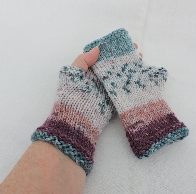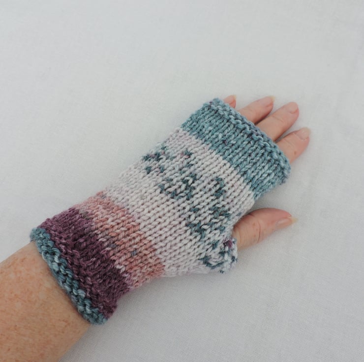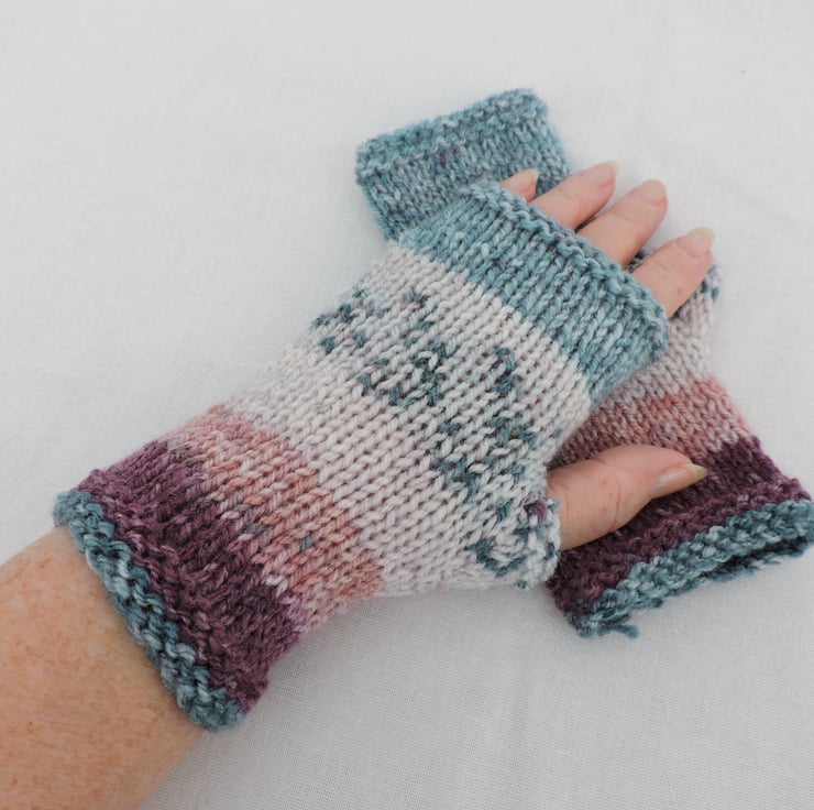 Clearance Sale now £3.00 I've knitted these Fair Isle style fingerless mitts in a multi coloured double knit acrylic yarn. They have a garter stitch cuff and top with a stocking stitch body. The colour is a Fair Isle style yarn of purple, pink, turquoise and white. Soft and warm.