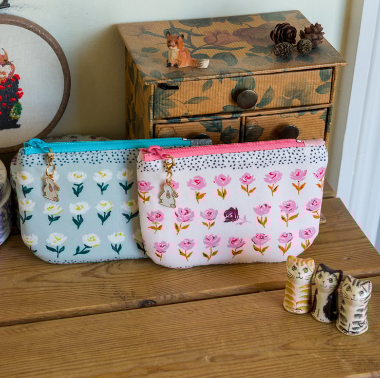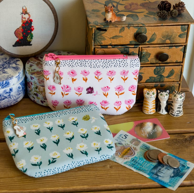 The shape of this purse is a simple little rectangle with nicely curved corners and the quality YKK zip is topstitched. The linings of these purses are both Essex Linen with added metallic threads - the blue print has a pale blue and silver lining and the pink has a pink and iridescent lining. Each of the purses also comes with the little bunny charm you see attached to the zip in the pictures, which you can also detach and use as progress keeper if you knit or crochet.