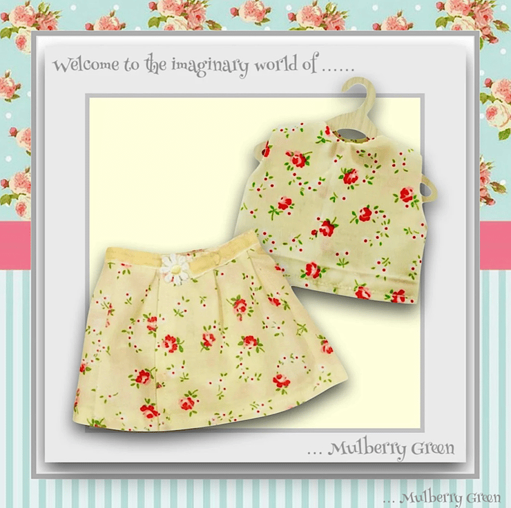 A sweet little back fastening blouse in a ditsy rose print and matching skirt, to fit the Mulberry Green characters. The outfit is made from best quality cotton.