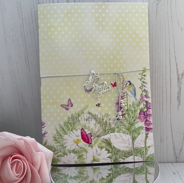 Beautiful cream and pink card with a blue tit and floral corner. Filled with 40 pages of lined paper. Silver elastic cord with beads and a butterfly charm to secure.