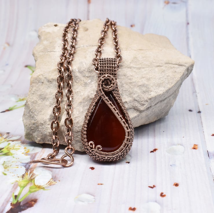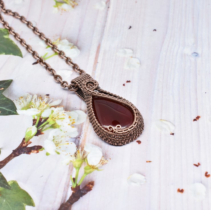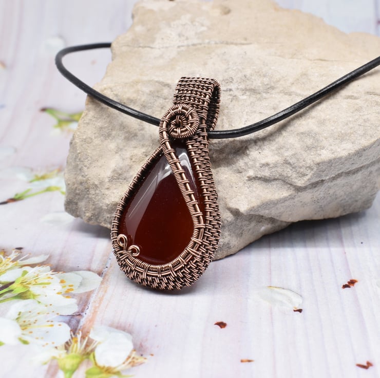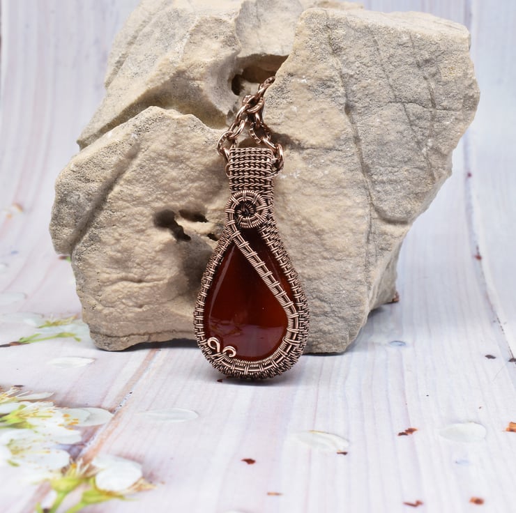 I have woven around this beautiful dark orange carnelian using solid copper wire to make this striking pendant.