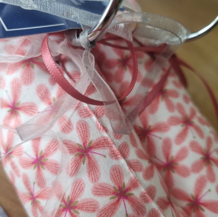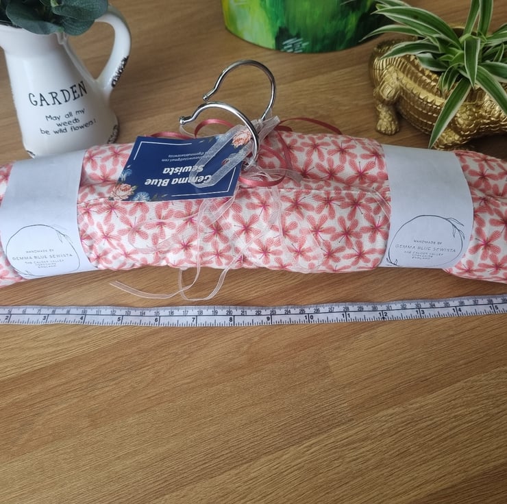 Pair of padded covered clothes hangers. Strong wooden hangers with polyester padding and fabric covers. This pair have an ivory background with a peachy pink stylised flower print, trimmed with satin & organza ribbons.