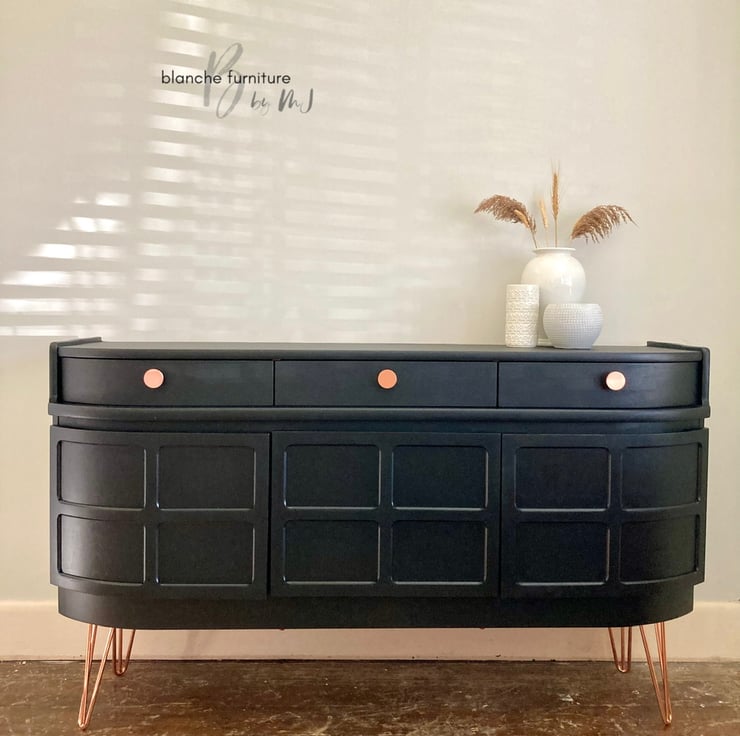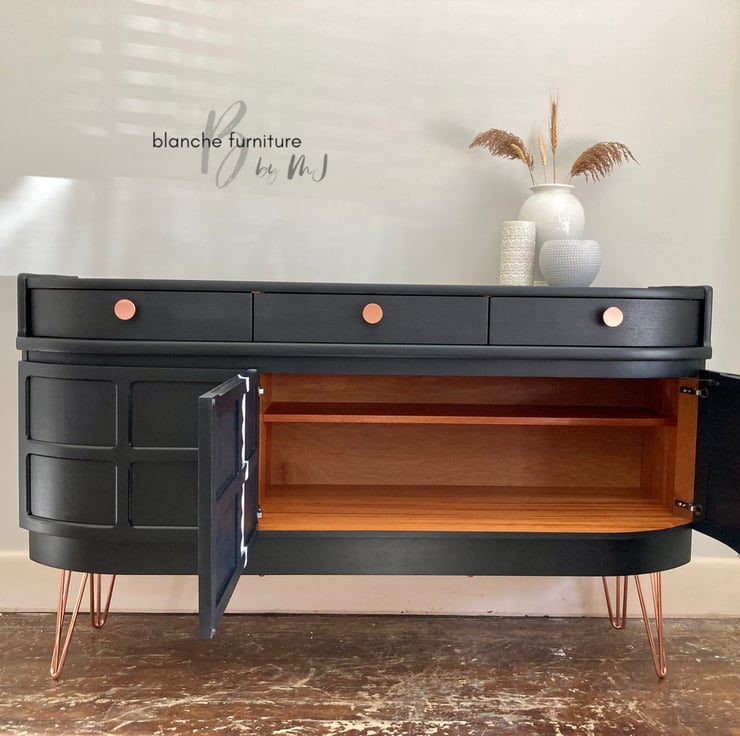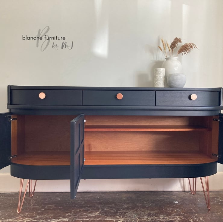 This Mid Century Modern sideboard has been professionally hand painted in a coal black and sealed with layers of varnish for protection against every day usage.