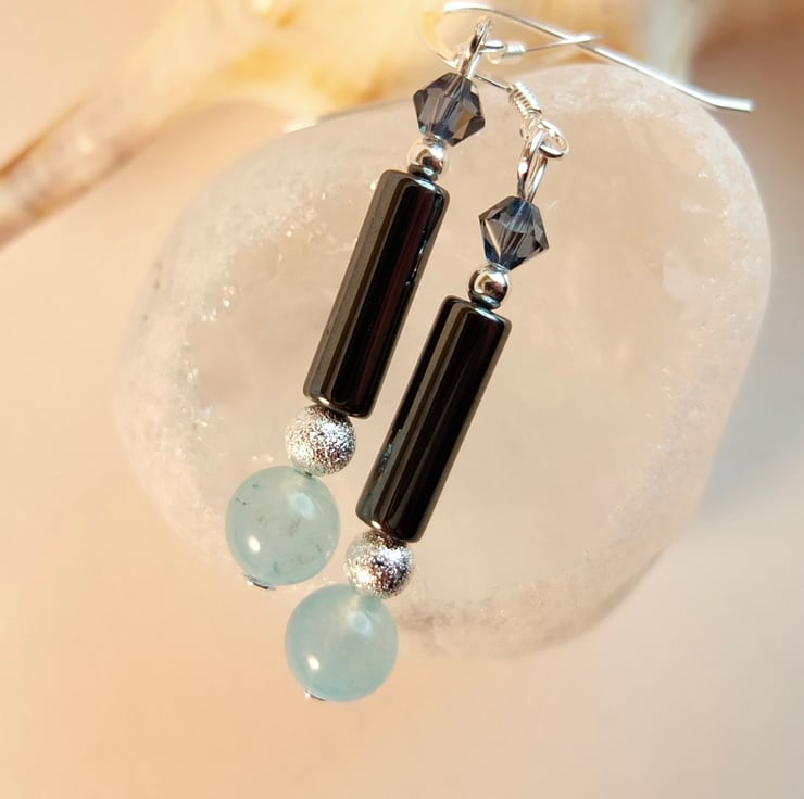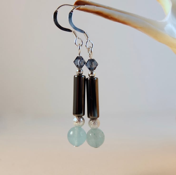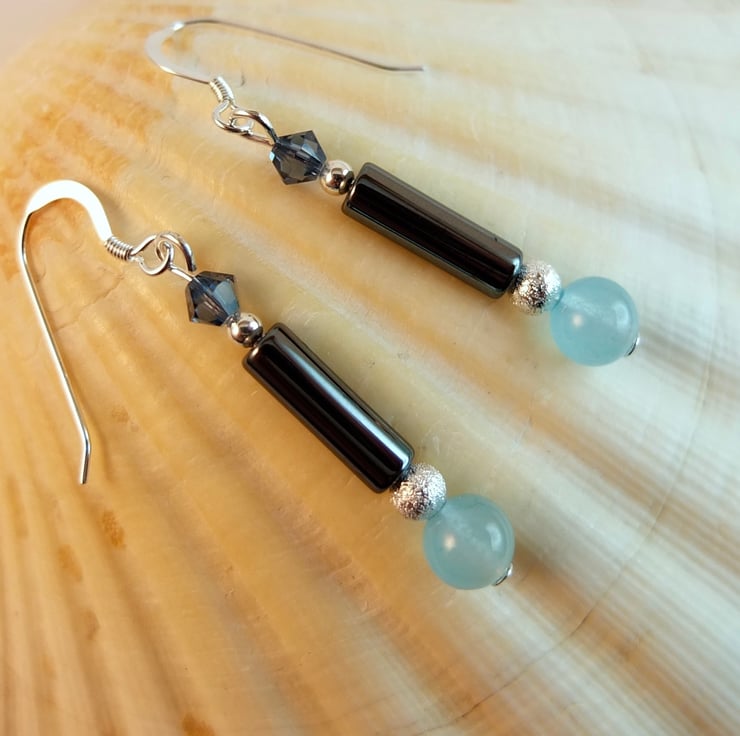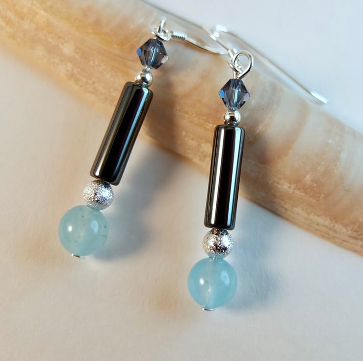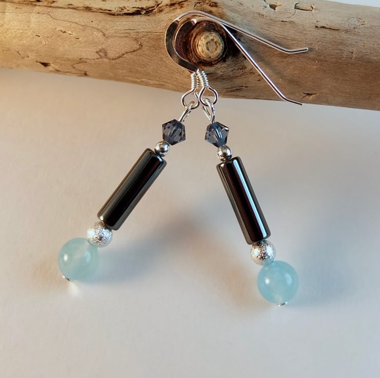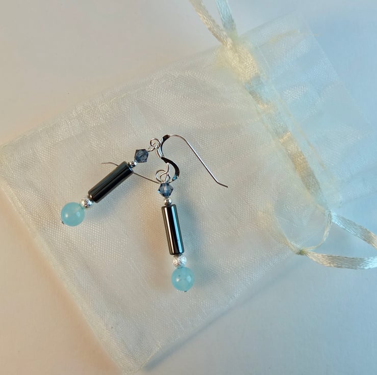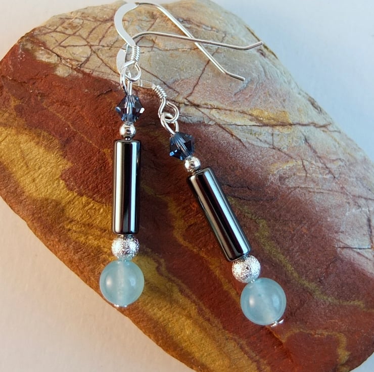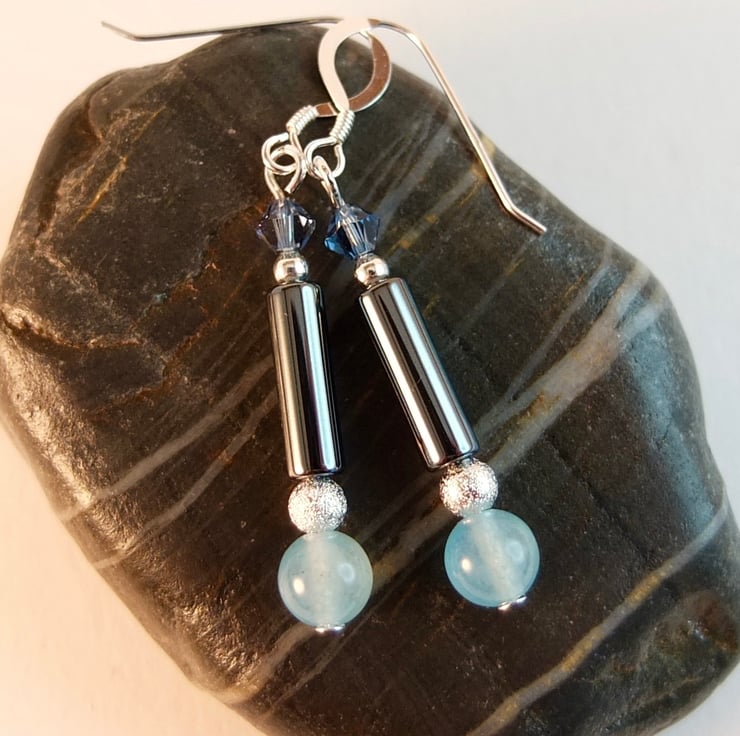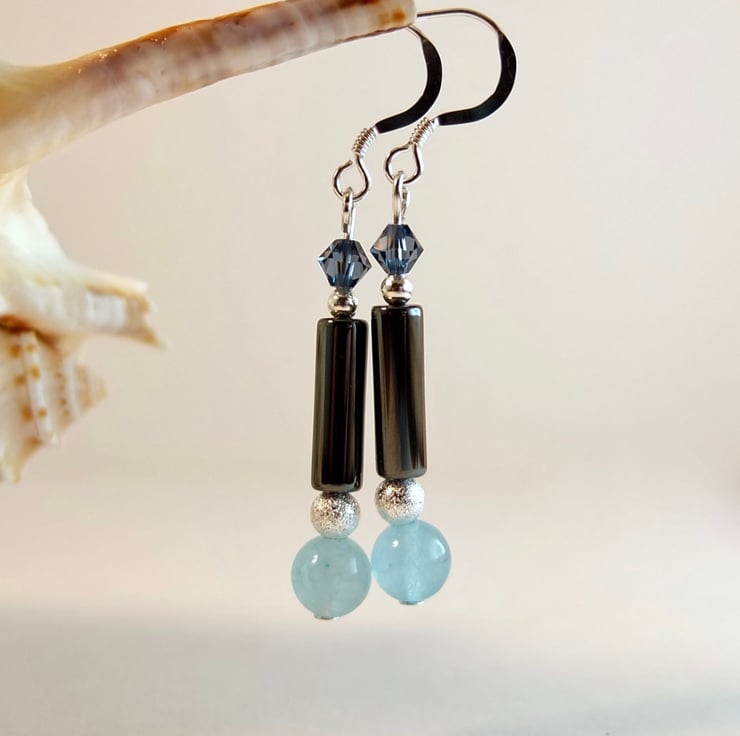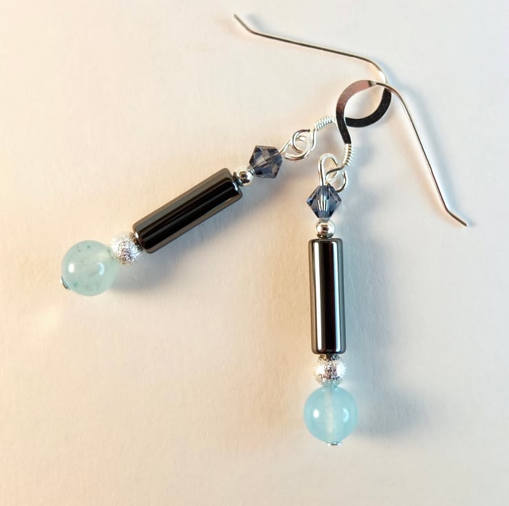 A 6mm mountain jade bead dyed aquamarine, a 4mm x 13mm hematite tube and a 4mm Swarovski bicone in a colour called "denim are separated by a 4mm silver stardust coated brass bead (nickel and lead free) and a sterling silver 2.5mm round.