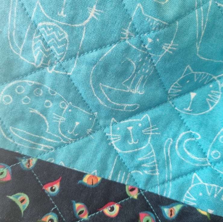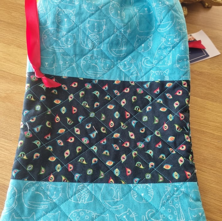 Quilted patchwork hot water bottle cover in turquoise line drawn cat print and navy multi coloured cat eyes print fabrics. Coordinating lining and deep scarlet satin ribbon drawstrings. The same fabrics and stripes pattern on both sides, lined in plain fabric.