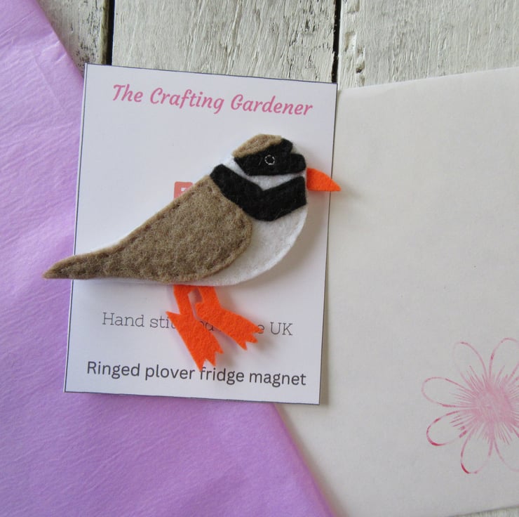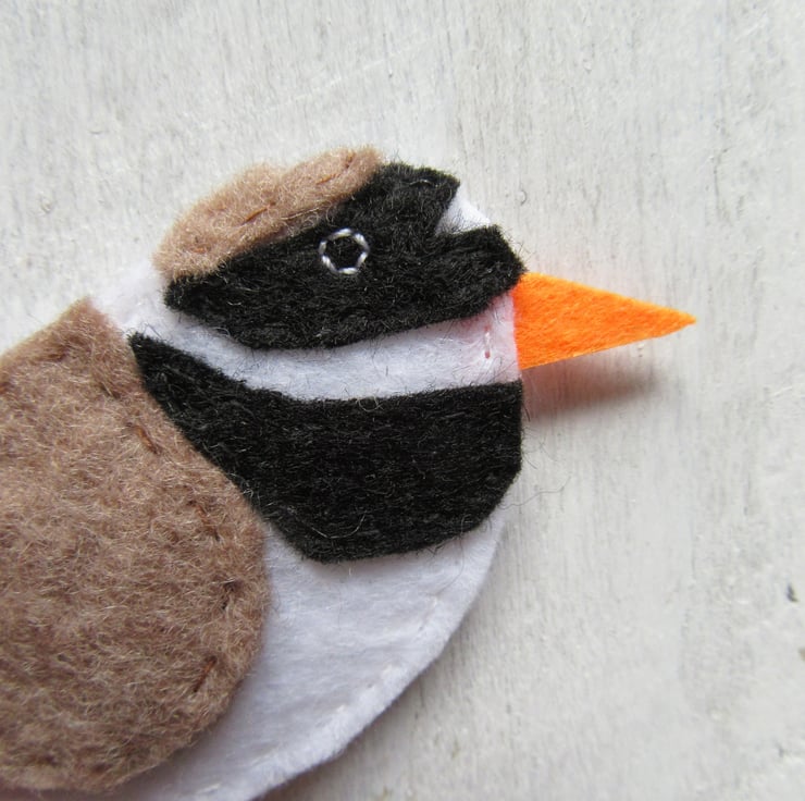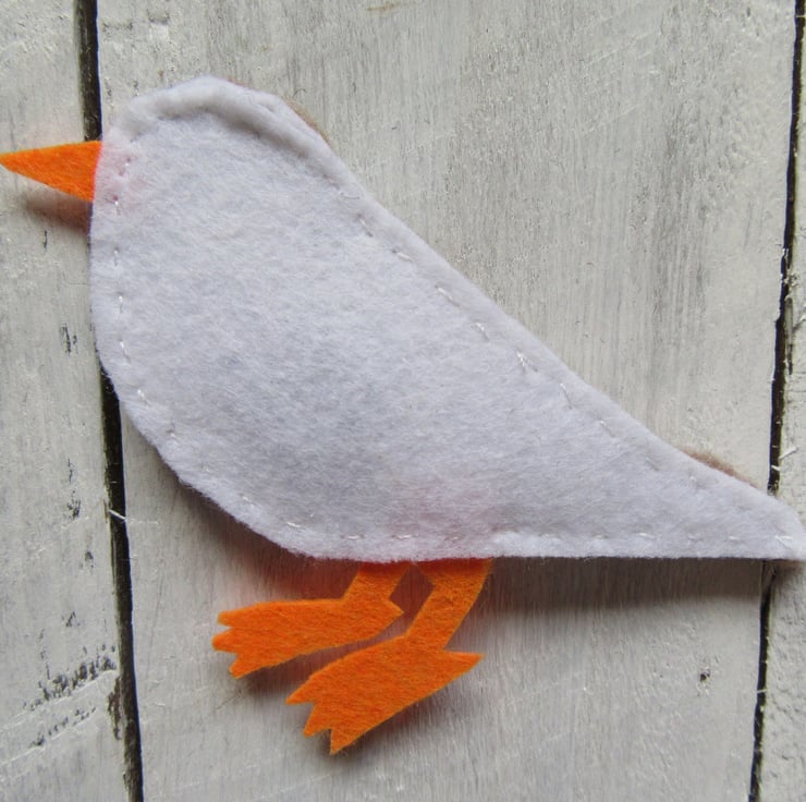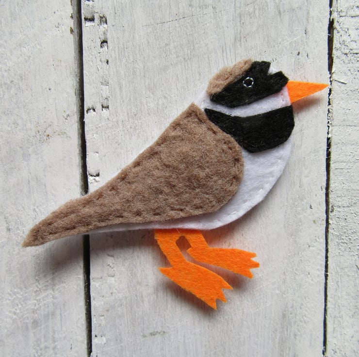 This little bird that is so often seen on the seashore is hand stitched from brown and black felt on a base of white felt, with orange legs and beak.