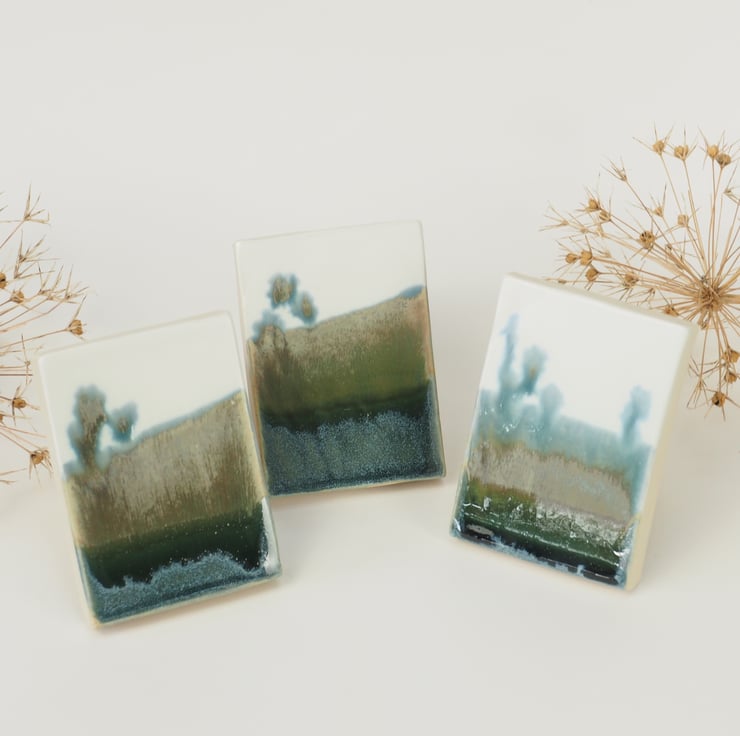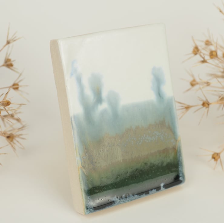 This ceramic ACEO has been handmade from stoneware clay and is decorated with an abstract landscape design, achieved from the mixing of 2 glazes which react and run to create a unique pattern.