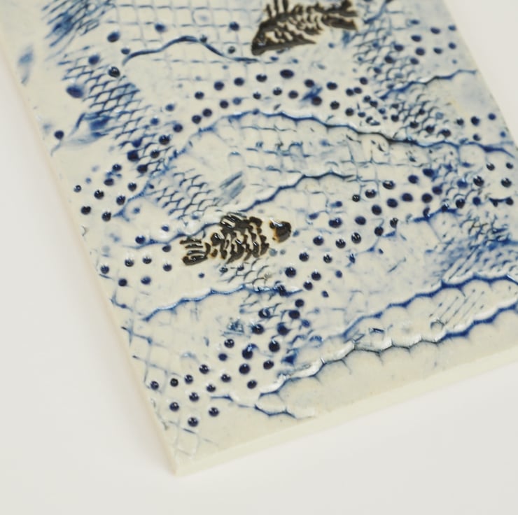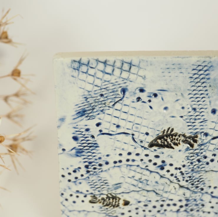 This is almost a ceramic ACEO, but it didn't shrink quite enough in the kiln, and measures 3 7/16th x 2 9/16th inches. The richly textured surface shows two small fish deep in the ocean. Lots of lovely detail in a small space, that you can spend a long time looking at!