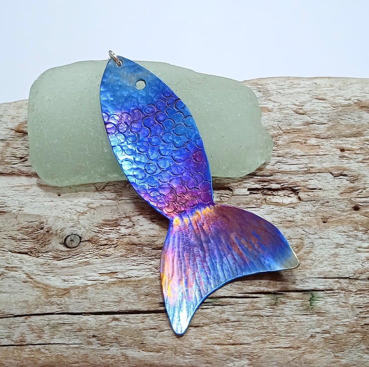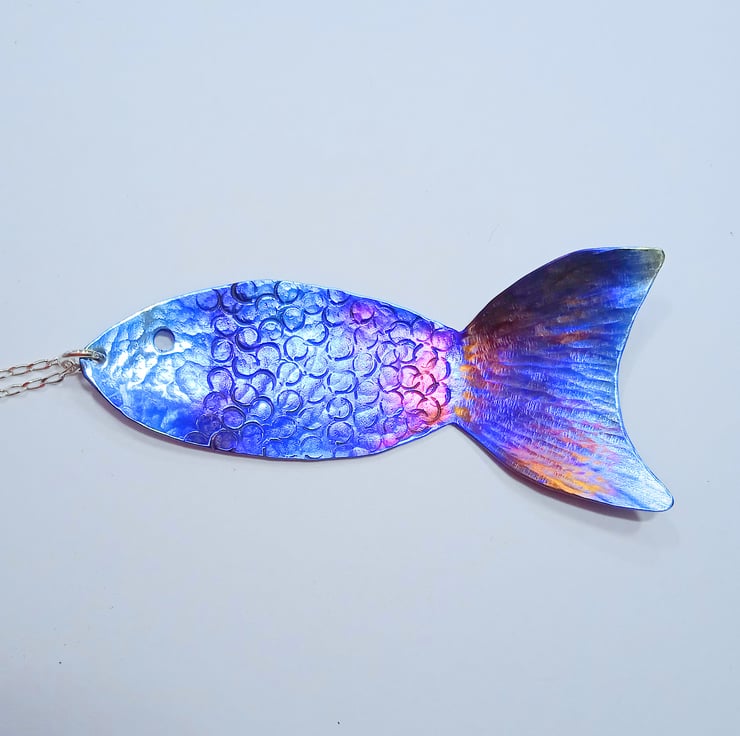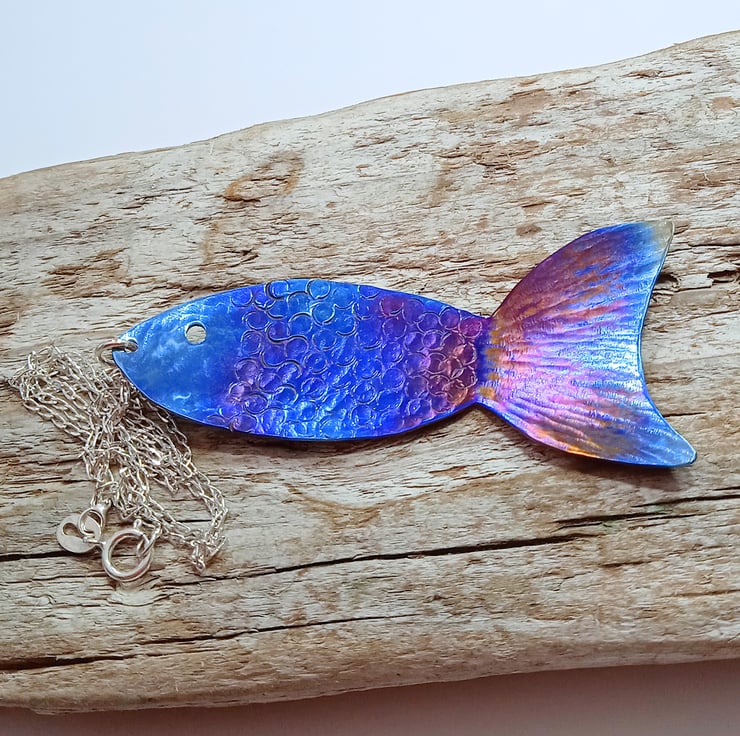 This beautiful lightweight titanium fish pendant displays a range of colour shades which really come to life when the light hits it.